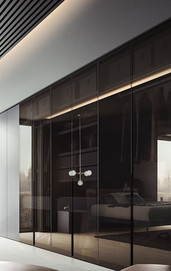 Glass reveals, reflects and mingles the inside with the outside in the most fascinating of ways. The mediator of this dialogue is the glass door panel, in Extraclear Transparent, Transparent or Satin Fumé and Stop Sol finishes and in the three colours available for Trama screen-printed glass: different aesthetic features for varying degrees of transparency. The door sports an intriguing, black, screen-printed frame. The long, slim, inclined handle is made from black anodised aluminium matching the frame and is discreet and handy on both hinged and sliding doors.