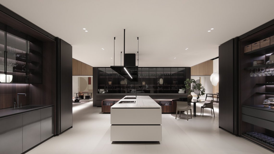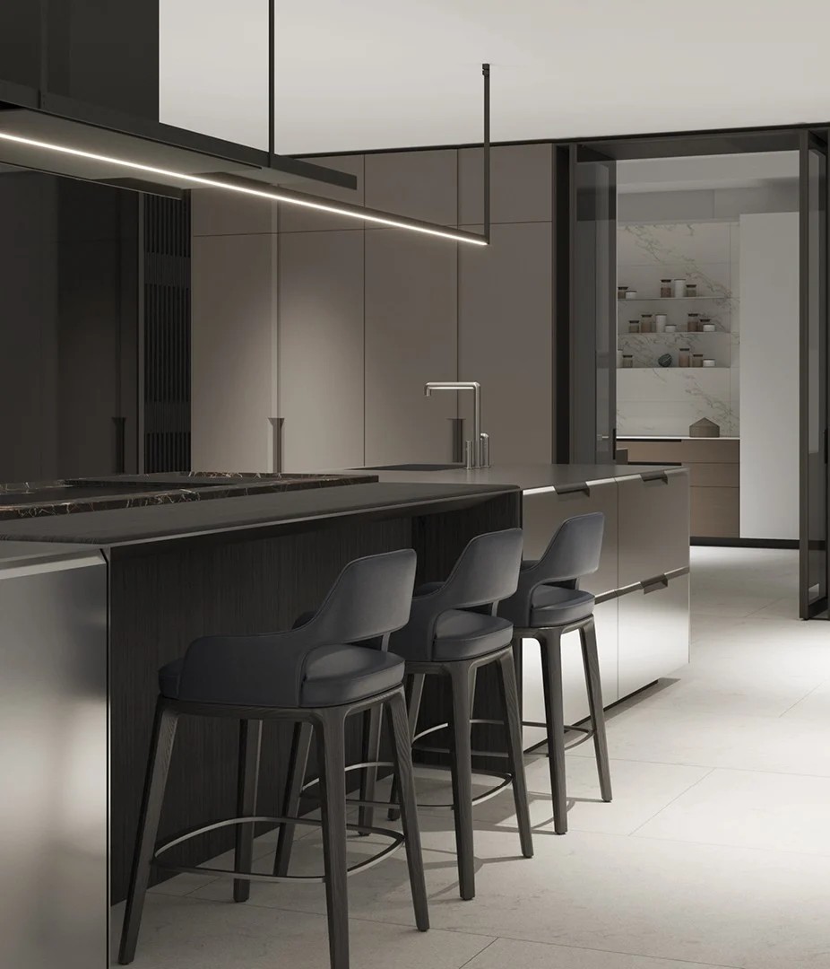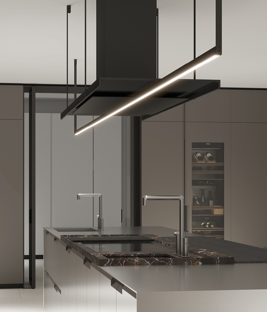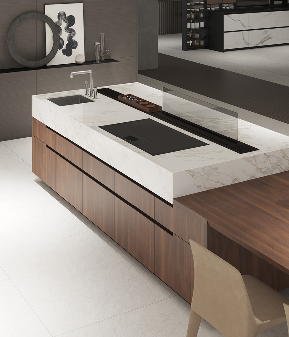 Poliform re-interprets the model Artex in the details in the light of a more contemporary and enticing aesthetics. Thus Artex Pro is born, a kitchen with well-marked lines where the tapered edges are sharper and deeper thus of more lightweight. The thicker worktop looks like floating on the base units. Conceived as complete system, Artex Pro is capable of making the operational area coexist with the dining area. The kitchen is completed with the homonymous system of cupboards that intersect with its volumes.