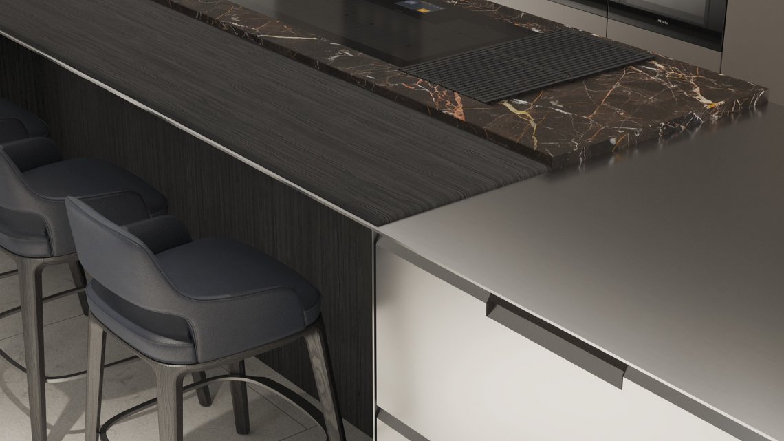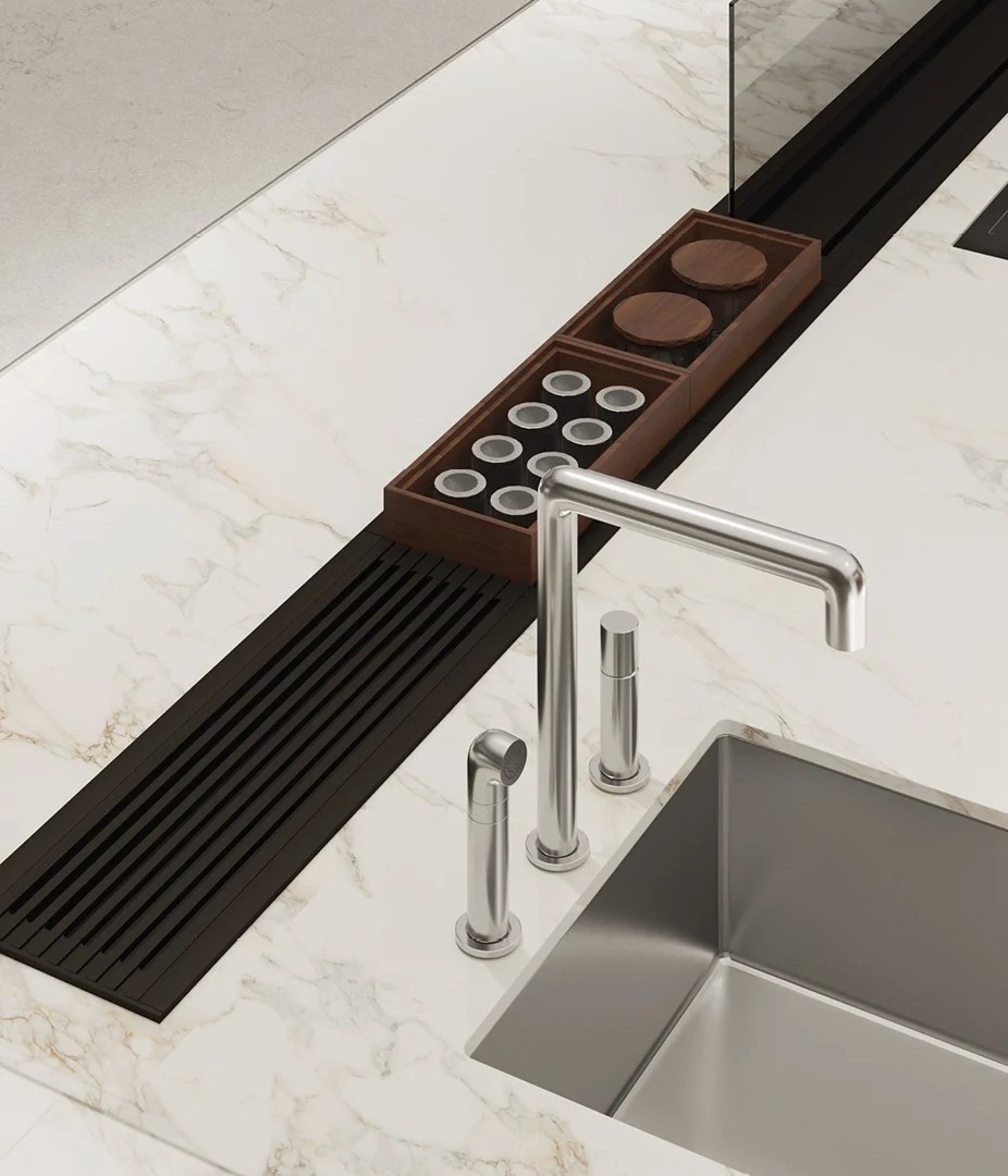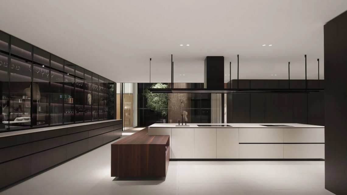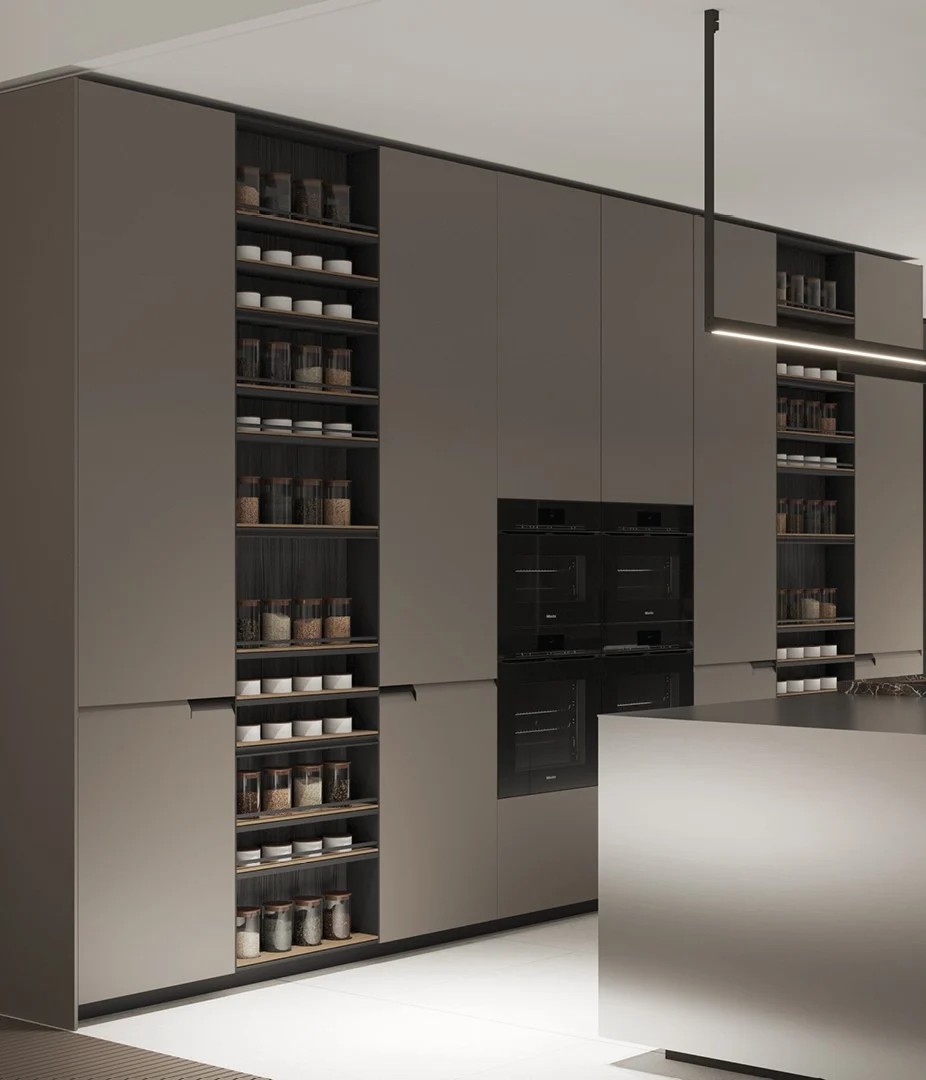 Poliform re-interprets the model Artex in the details in the light of a more contemporary and enticing aesthetics. Thus Artex Pro is born, a kitchen with well-marked lines where the tapered edges are sharper and deeper thus of more lightweight. The thicker worktop looks like floating on the base units. Conceived as complete system, Artex Pro is capable of making the operational area coexist with the dining area. The kitchen is completed with the homonymous system of cupboards that intersect with its volumes.
