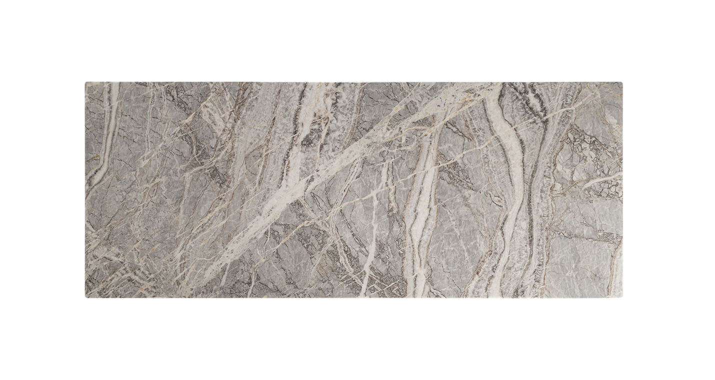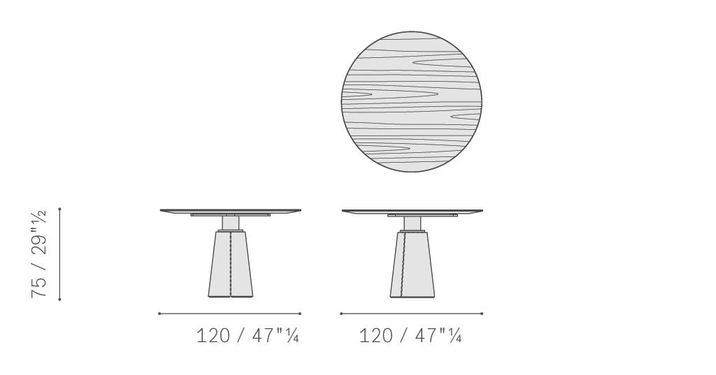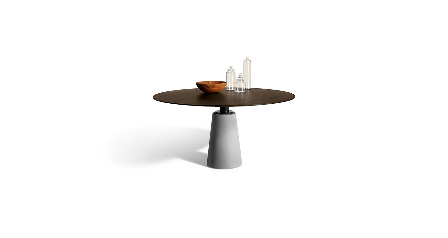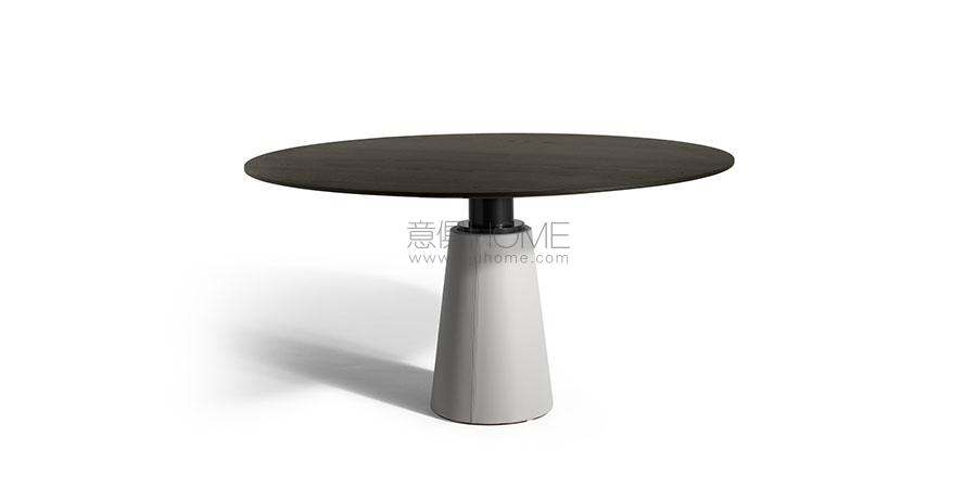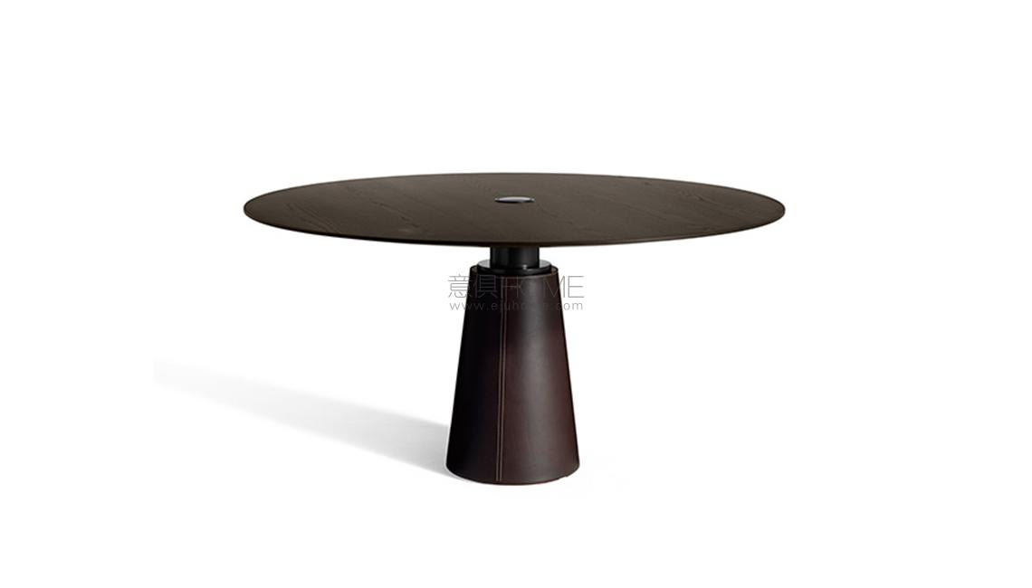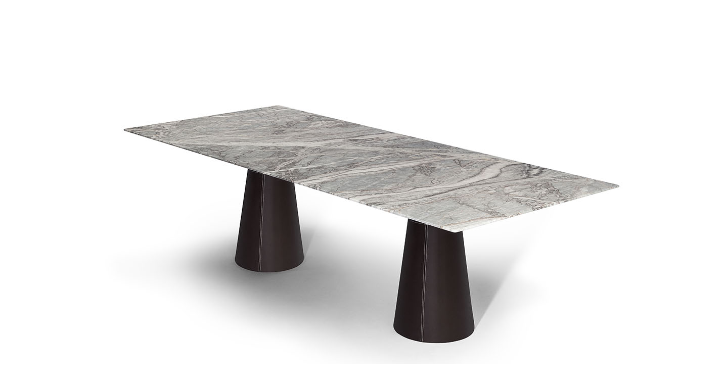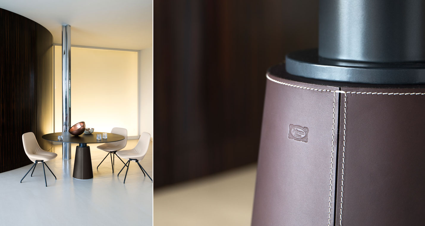 直徑135厘米的Mesa款式使用板巖桌面和塞茵那石支柱,此外還有其它尺寸,擴展用途,并發展為Mesa Due款式:直徑150厘米的午餐桌、直徑120厘米的便餐桌。桌面使用中密度木質纖維,鑲貼雞翅木色或摩卡色梣木片,或覆蓋Pelle Frau?軟皮。Mesa Due基座可以為灰色塞茵那石或鋼材,后者覆蓋Cuoio Saddle Extra皮革并使用對比色縫線,或Pelle Frau? Color System軟皮并使用同色深淺縫線。鋼制底座通過特殊的內部配重系統保持穩定性,端部具有塑料塑形包頭,用于保護地板。桌面和支柱之間的連接為棕黑漆鋼管,支撐一個三臂交叉支桿,配有調節支架用于桌面調平。