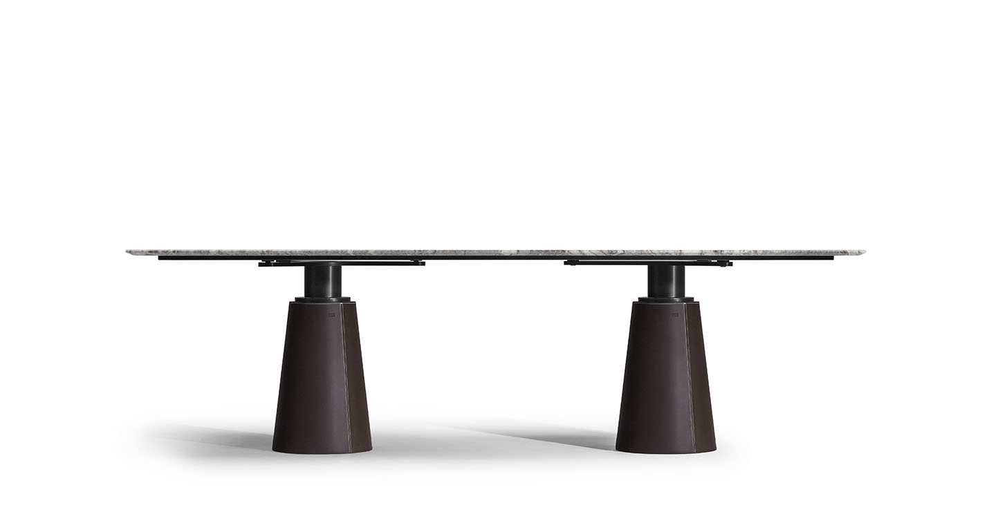 Mesa Due餐桌采用軟皮和皮革支桿,可以安裝電動伸縮塔柱,由客戶在購買時選擇和指定。