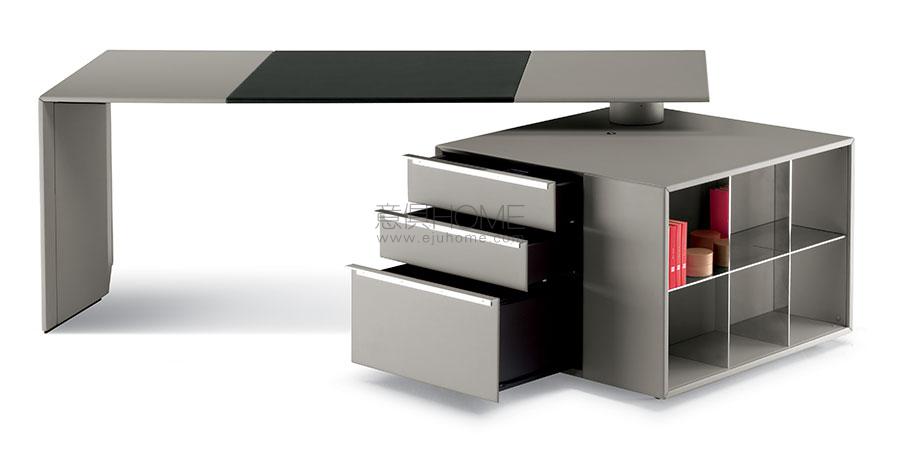 CEO Cube Desk老板桌采用不對(duì)稱結(jié)構(gòu),使用管形支承框架和金屬片橫撐,配有專門的走線系統(tǒng)和電氣系統(tǒng)。桌面和支柱使用圓邊雙層板,外側(cè)覆蓋Pelle Frau?軟皮或使用黑胡桃木貼面。兩種版本均使用軟皮中央板。下桌面板材使用黑色紋理噴漆木纖維。支承寫字臺(tái)一側(cè)的方塊配有自旋轉(zhuǎn)系統(tǒng)。配有兩個(gè)帶配件的抽屜以及一個(gè)配鎖分類柜,外側(cè)配有外露隔槽,通過(guò)拋光鋁格柵分割。方塊也覆蓋Pelle Frau?軟皮。