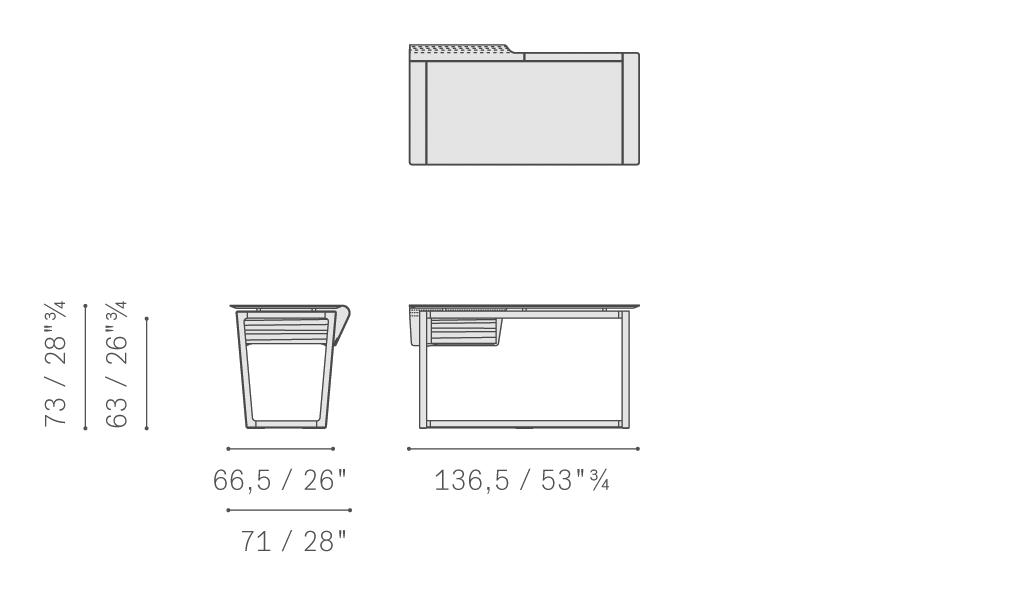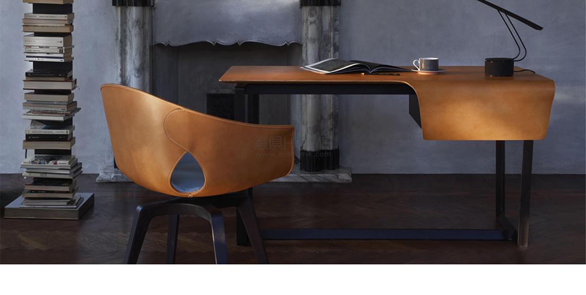 Fred寫字臺結構使用雞翅木色或摩卡色梣木實木,具有三角形截面,彰顯輕盈感。構成寫字臺的抽屜也使用相同的材料和表面處理,安裝在金屬導軌上,使用緩沖開閉系統。桌面使用來自整張牛皮的Cuoio Saddle Extra皮革,厚度4毫米,無切割或縫線。邊緣剪裁整齊,染色并涂有保護蠟。金屬配件采用槍管色電鍍處理,涂有保護漆料。