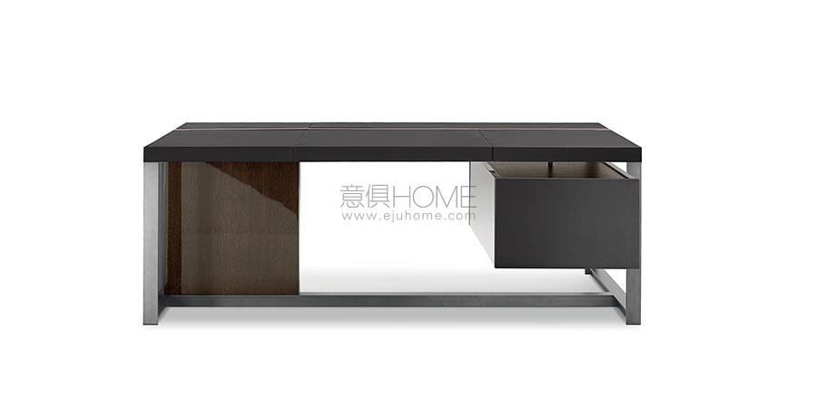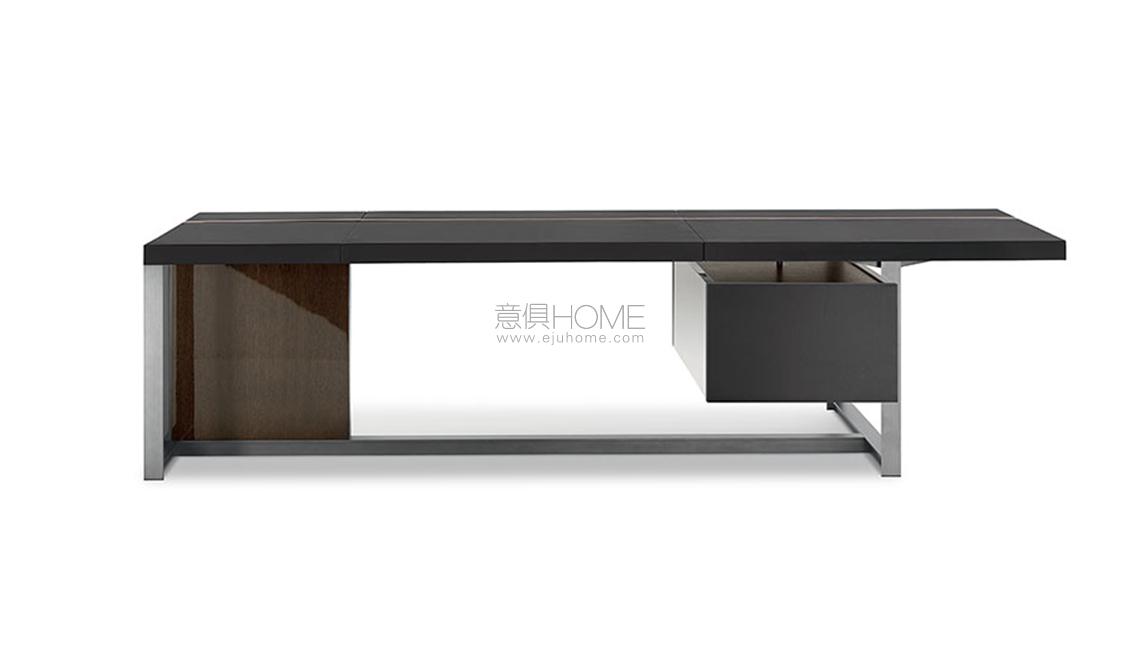 Jobs President Desk寫字臺桌面覆蓋Pelle Frau?軟皮,搭配鉛色或煙草色無?;的緱l,整個長度上使用啞光表面處理,將工作區域和“客戶區域”分開。“客戶區域”可以覆蓋Pelle Frau?軟皮,與桌面其他部分相搭配,或使用鉛色或煙草色啞光無?;的举N面,與支桿或收納柜相搭配。桌面也配有滑門,可以露出一個小型內部隔槽,與筆架托盤相連,也可方便走線。
