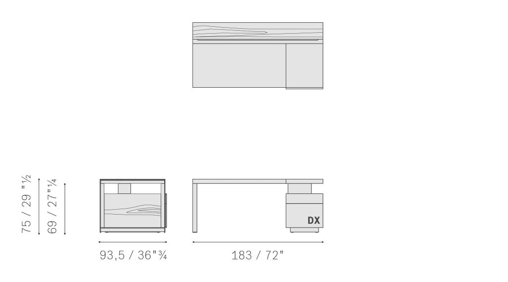 為了更好的回應靈活和當代工作空間的需求,Jobs寫字臺提供不同尺寸:President和Executive Desk分為標準、大號和72”版本。Easy Desk分為標準和大號版本。桌面與收納柜相結合,后者通過走線管與寫字臺相連。Jobs Presidente Desk的抽屜柜配備一個外露隔槽和兩個抽屜。Jobs Executive Desk配有懸掛收納柜,由兩個抽屜和一個分類區構成。抽屜和文件分類柜均配備緩沖歸位裝置,面板覆蓋Pelle Frau?軟皮。兩個收納柜的結構均采用特色“T”型橫截面鉛色噴漆磨砂鋼以及中密度木質纖維,使用鉛色或煙草色拋光表面處理無梗花櫟木貼面。