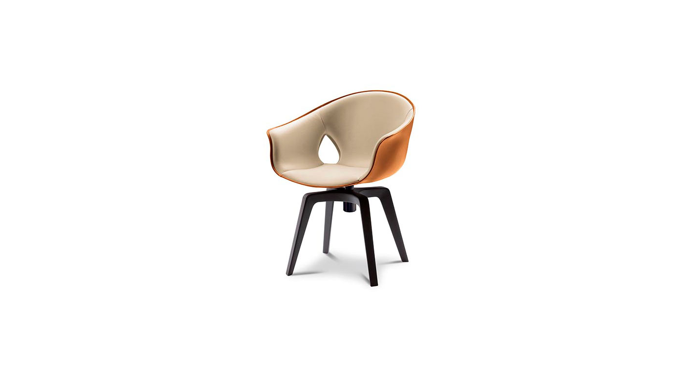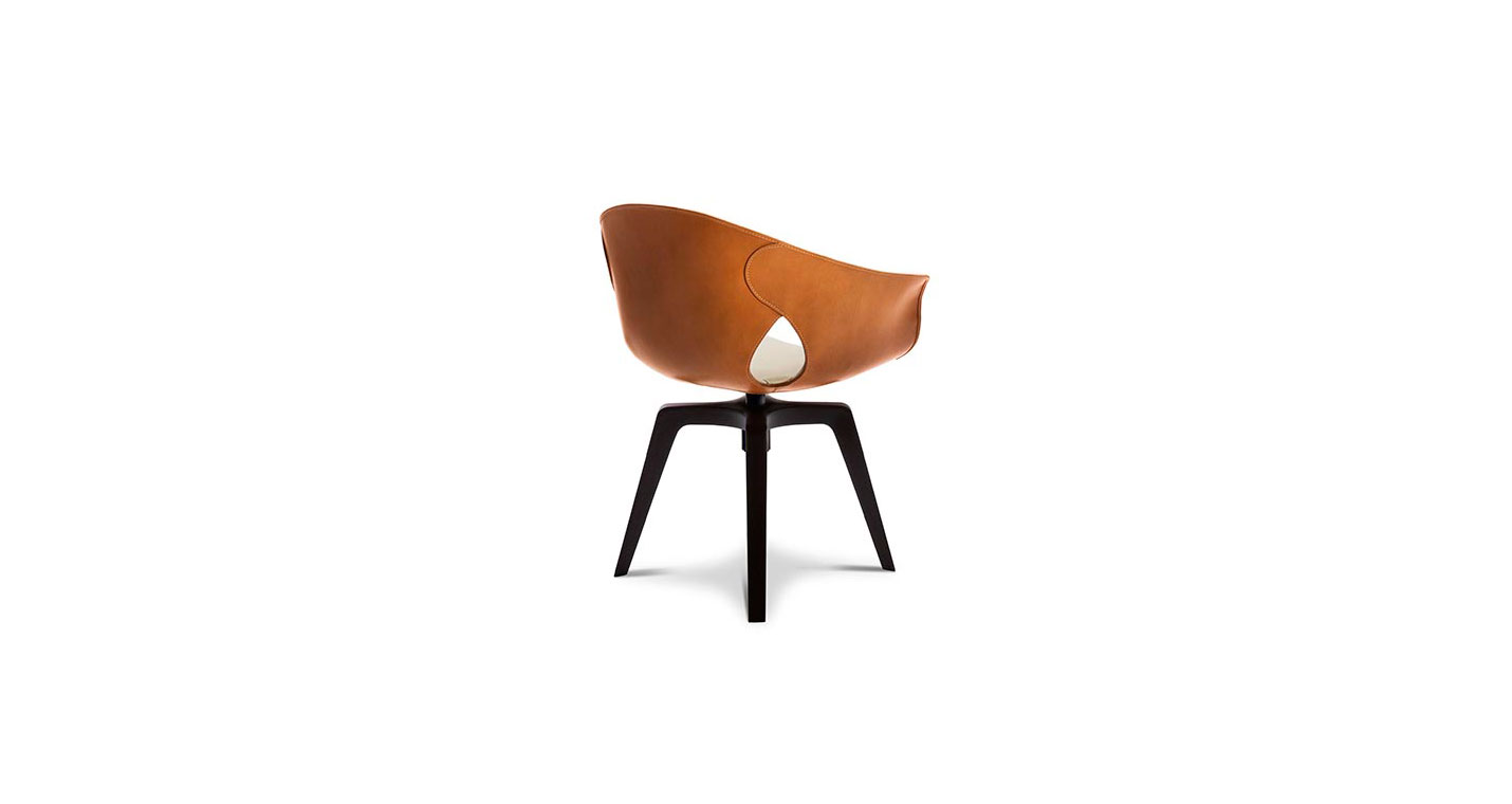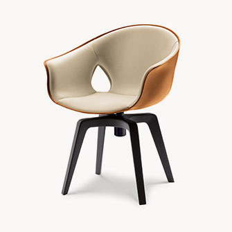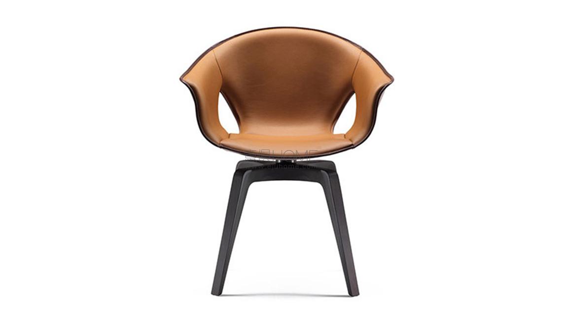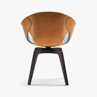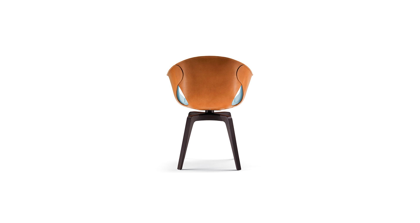 Ginger小扶手椅主體采用印壓成型合成熱塑聚酯。主體與基座之間的固定通過黑漆鋼支架實現。旋轉版本中,可以旋轉360°并回到初始位置。包墊采用聚氨酯泡沫。Ginger外部覆蓋厚度4毫米的無接縫Cuoio Saddle皮革或Saddle Extra皮革。內部覆蓋Pelle Frau?軟皮,具有令人喜愛的材質對比。四支腿底座使用雞翅木色或摩卡色梣木實木,具有三角形截面。