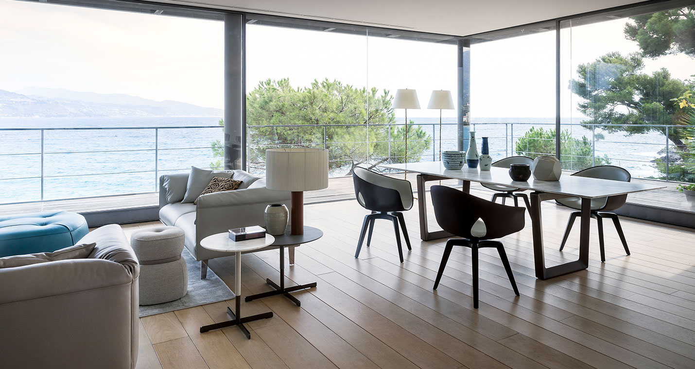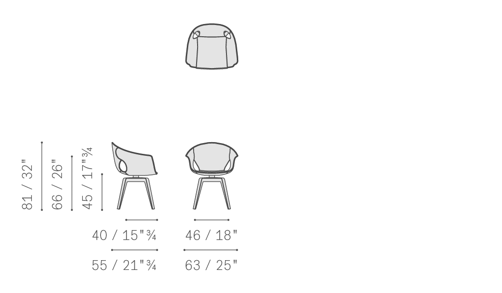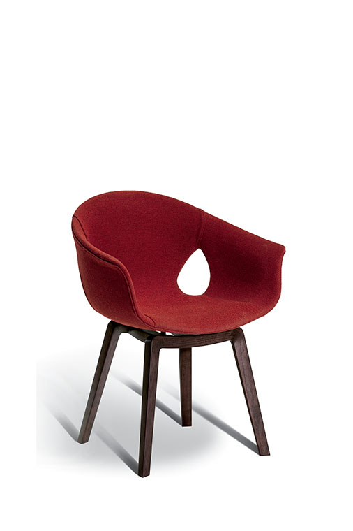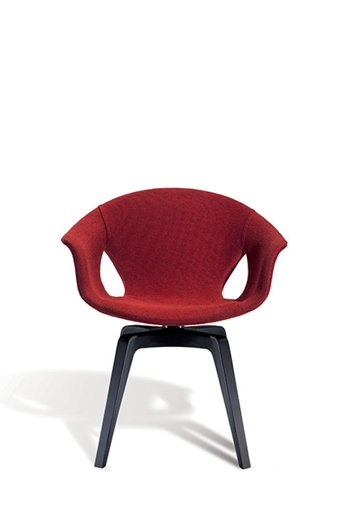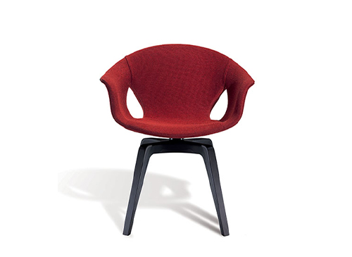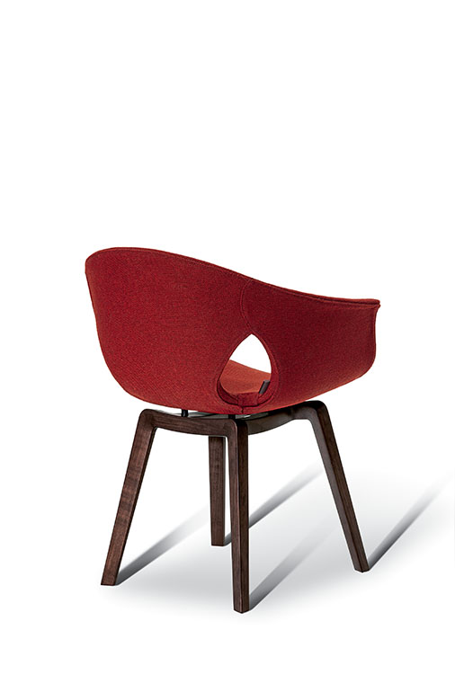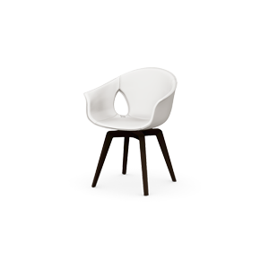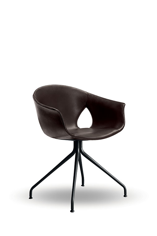 Ginger小扶手椅主體采用印壓成型合成熱塑聚酯。主體與基座之間的固定通過黑漆鋼支架實現。旋轉版本中,可以旋轉360°并回到初始位置。包墊采用聚氨酯泡沫。Ginger外部覆蓋厚度4毫米的無接縫Cuoio Saddle皮革或Saddle Extra皮革。內部覆蓋Pelle Frau?軟皮,具有令人喜愛的材質對比。四支腿底座使用雞翅木色或摩卡色梣木實木,具有三角形截面。