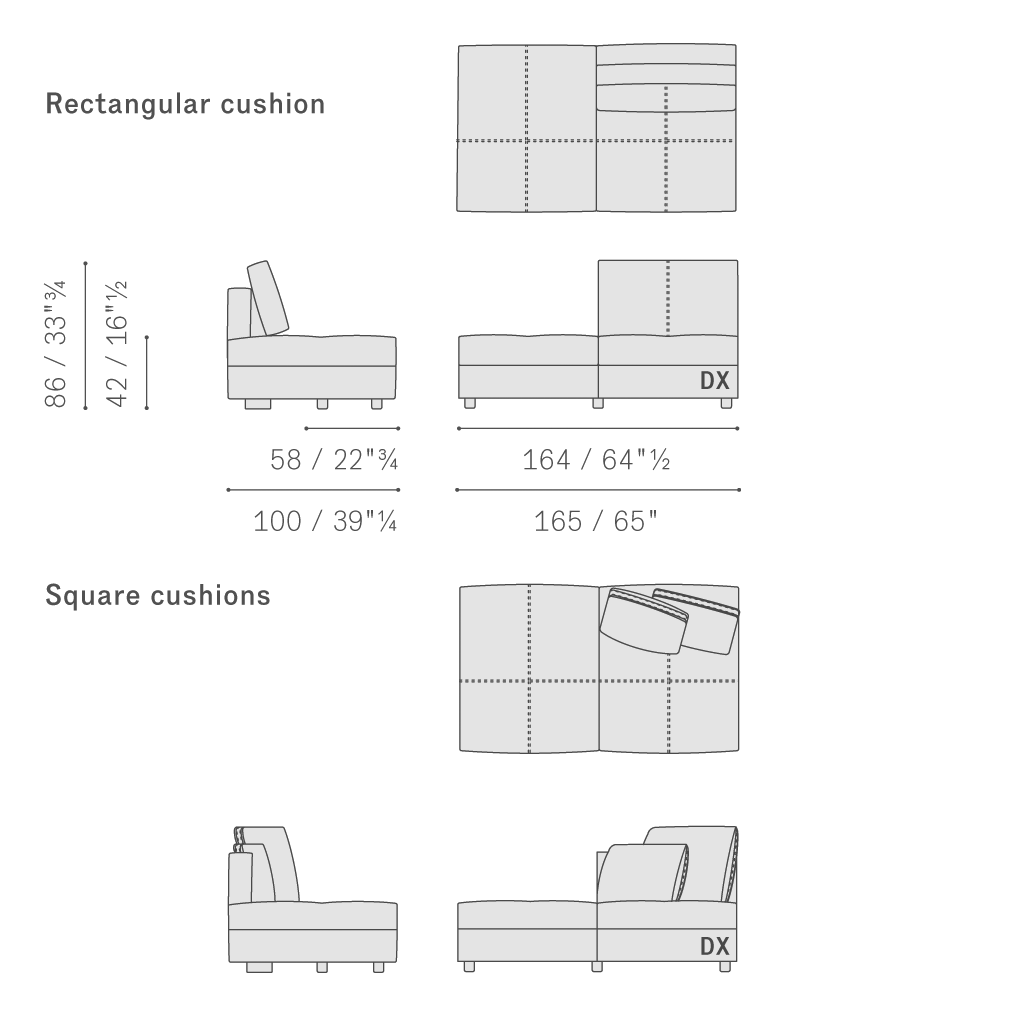 Massimosistema沙發分為單人座、雙人座和三人座,可以選擇是否搭配扶手,此外還有躺椅、沙發島和圓沙發凳,完全可以獨立使用,或互相搭配。沙發結構采用櫸木和陳年楊木,側面使用樺木膠合板和中密度纖維板墊層。彈簧結構使用松緊帶。坐墊填充鵝絨和聚酯絮絨,添加聚氨酯泡沫嵌塊。扶手分為三種款式:高、中、低,無論是閉合式配置、組合模塊或非對稱配置,互相之間均可搭配。可以整體覆蓋Pelle Frau?軟皮(包括雙色),或選配多種材質。