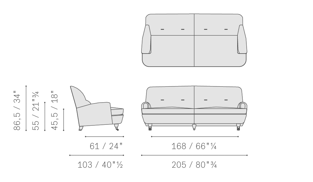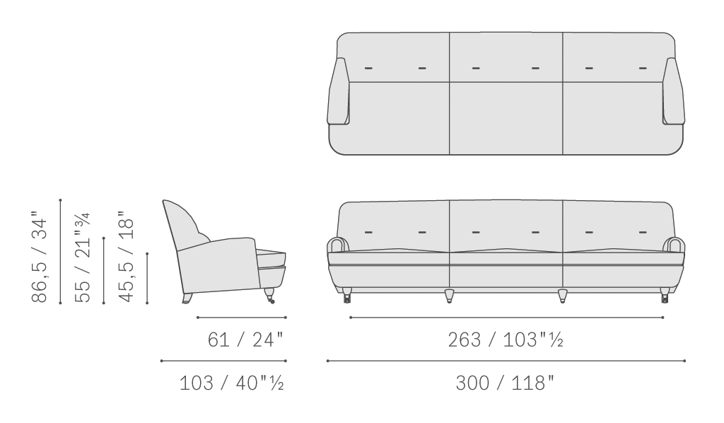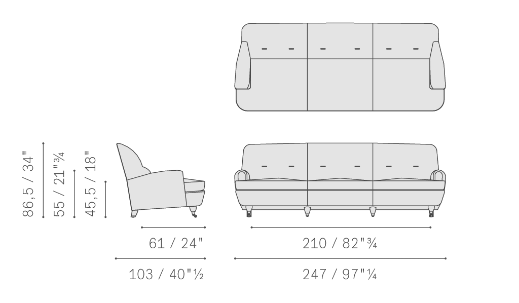 Novecento沙發和扶手椅支撐結構采用楊木和陳年櫸木。座墊彈簧結構采用手編鋼制雙錐形彈簧,架在黃麻帶上?;鼔|填充涂膠馬鬃和聚氨酯泡沫,而靠背包墊則填充聚氨酯泡沫和聚酯棉,靠墊填充鵝絨。扶手包墊采用印壓聚氨酯泡沫。深胡桃木色櫸木支腳。后側支腳總是使用鍍鉻黃銅底腳。前側支腳則配備鍍鉻黃銅自轉輪,或與后側支腳相同,采用鍍鉻黃銅底腳。靠背上Pelle Frau?軟皮覆面添加一對長方形皮面扣。