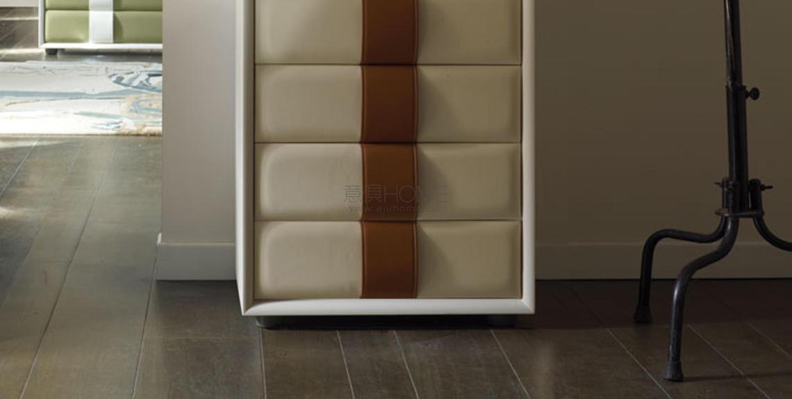 Obi收納柜系統(tǒng)可選奶白色防劃漆料漆繪,或使用木材,搭配棕胡桃木片貼面。Obi抽屜柜、床頭柜和七斗小柜的抽屜安裝在金屬導軌上,帶有緩沖閉合。抽屜面板和把手完全覆蓋Pelle Frau?軟皮,顏色相同或相異,使用同色深淺或?qū)Ρ壬瓜蚩p線,具有細膩的裝飾效果。每個Obi收納柜的臺面均可根據(jù)需要配備典雅的Pelle Frau?軟皮墊。
