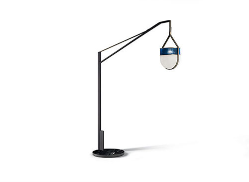 落地式臂燈版本由單一超大懸掛燈籠構成。支承桿為鍍色磨砂鋼。固定發光體的Saddle Extra鞣皮條一直垂到底座處,包裹鋼制支柱后半部分。底座由圓形半拋光馬齊納黑大理石構成,裝有金屬平衡矮基座。大理石基座邊緣有框架。底座的所有金屬細節均采用鍍色磨砂表面處理。