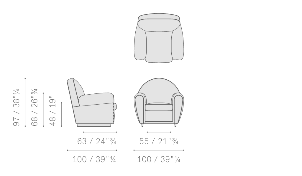 Vanity Fair XC沙發(fā)椅底座為100x100 cm,高97 cm。支承結(jié)構(gòu)采用陳年櫸木實木。包墊使用手工塑形植物纖維和涂膠馬鬃,坐墊使用鵝絨,帶聚氨酯泡沫內(nèi)芯,以確保長久形狀不變。座板、靠背和扶手彈簧結(jié)構(gòu)使用手編鋼制雙錐形彈簧,固定在黃麻帶上。沙發(fā)椅背板和側(cè)面以一排皮面釘子固定。表面可以覆蓋Pelle Frau?軟皮或布藝。背板骨架上嵌有槍管色表面處理或鍍金銘牌,帶有Poltrona Frau?標志。