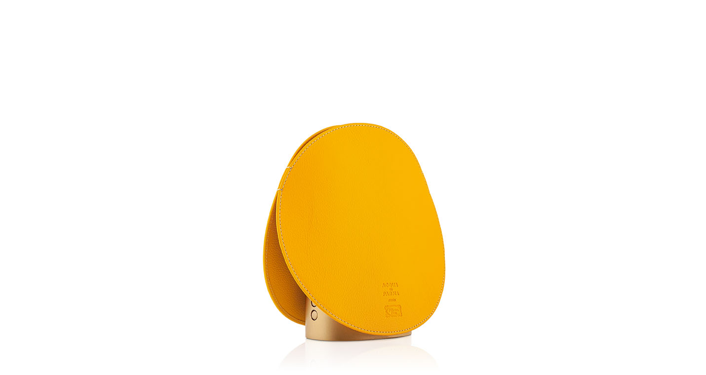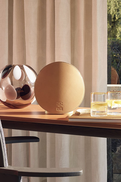 Airound?自動香氛器由二人組合GamFratesi設計,由兩個元素組成:主體,從中擴散香氣;圓形香氛罩,採用精美的PelleFrau?軟皮製作,有四種不同的顏色以及Cuoio Saddle Extra皮革版本可選。設計線條極為流暢,由兩塊軟皮或皮革圓盤組成,帶有對比色縫線和同色系染色邊緣。一個半柔性塑膠材質的支撐,用以確保穩定性。