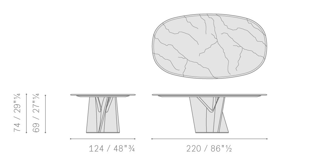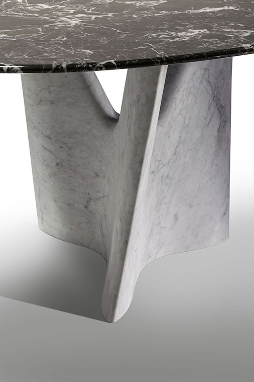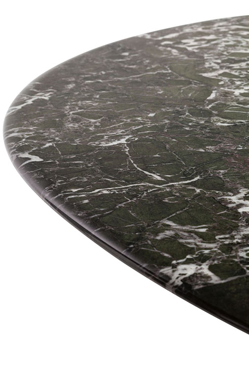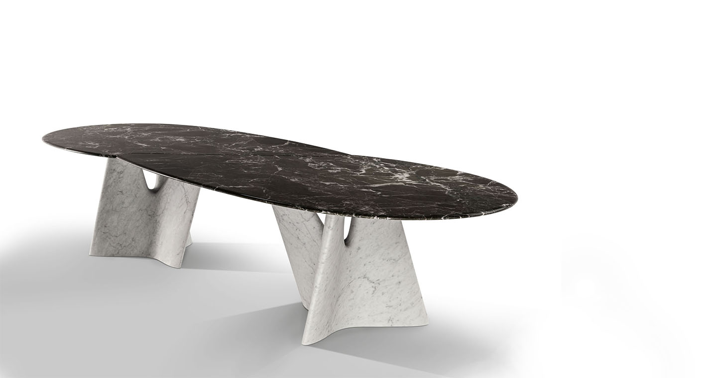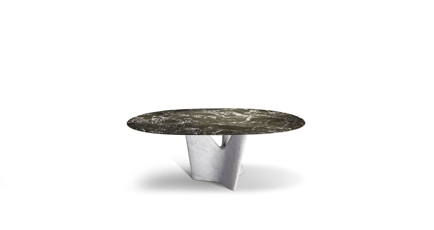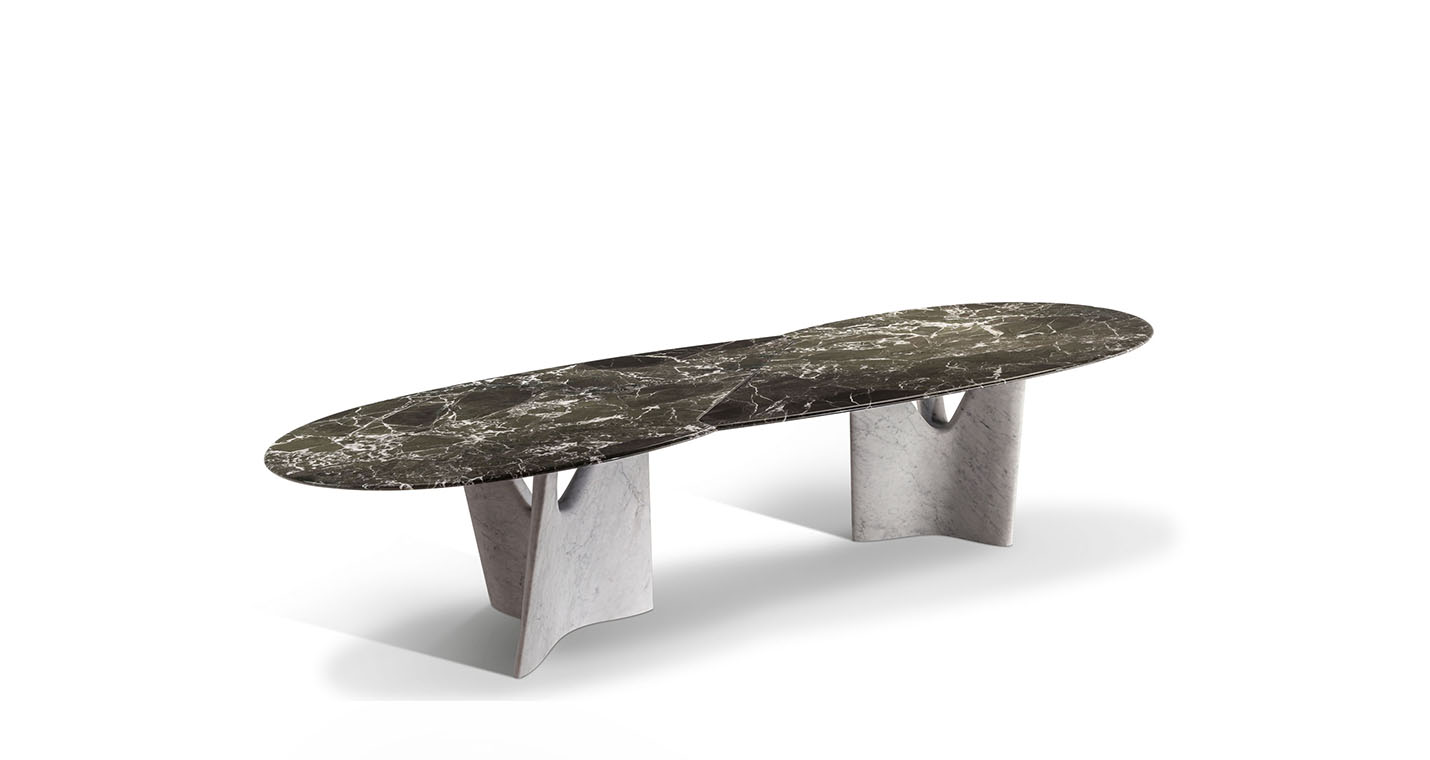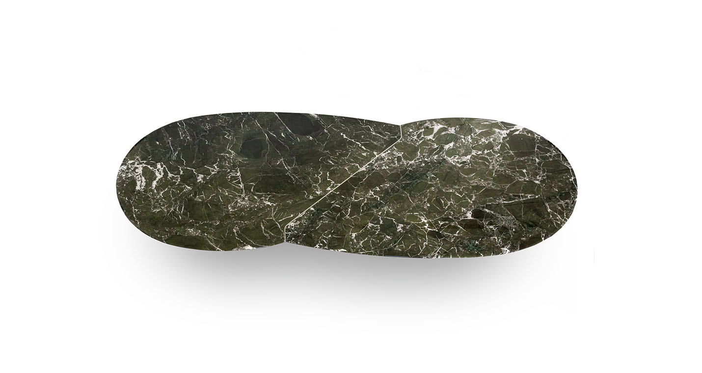 這一切都始自土耳其的一個採石場,在那裡挖掘出了珍貴的“紫羅紅”大理石,與生俱來從紅色到紫色的色調,白色條紋點綴其間。由于某些未知且莫名其妙的自然事件,山的一小塊有限的部分變成了濃重的鼠尾草色,并帶有深綠的漸變色,典型的淺色紋理從中穿過,還夾雜著一些小的紅色原色。Roberto Lazzeroni從中挖出一個帶有圓形線條的寬大桌面,凸顯出斑駁綠色所有漸變色中最明快或最朦朧的美感。不可複製的自然紋理,每件樣品都獨一無二。交錯的雙橢圓形狀部分使人聯想起陰陽的互補形式,部分像是個翻倒的8,象徵永無止境的完整和繁榮:由此得名。每只桌腳均由一整塊大理石雕鑿而成,但絕無沉重感的印象:樹狀“枝條”向外展開,盡顯輕盈與動感之態,進一步彰顯出桌子的優雅氣質和強烈的雕塑價值。