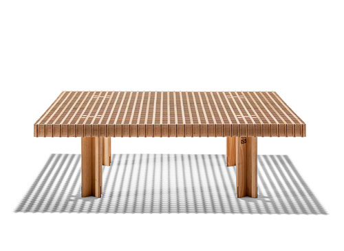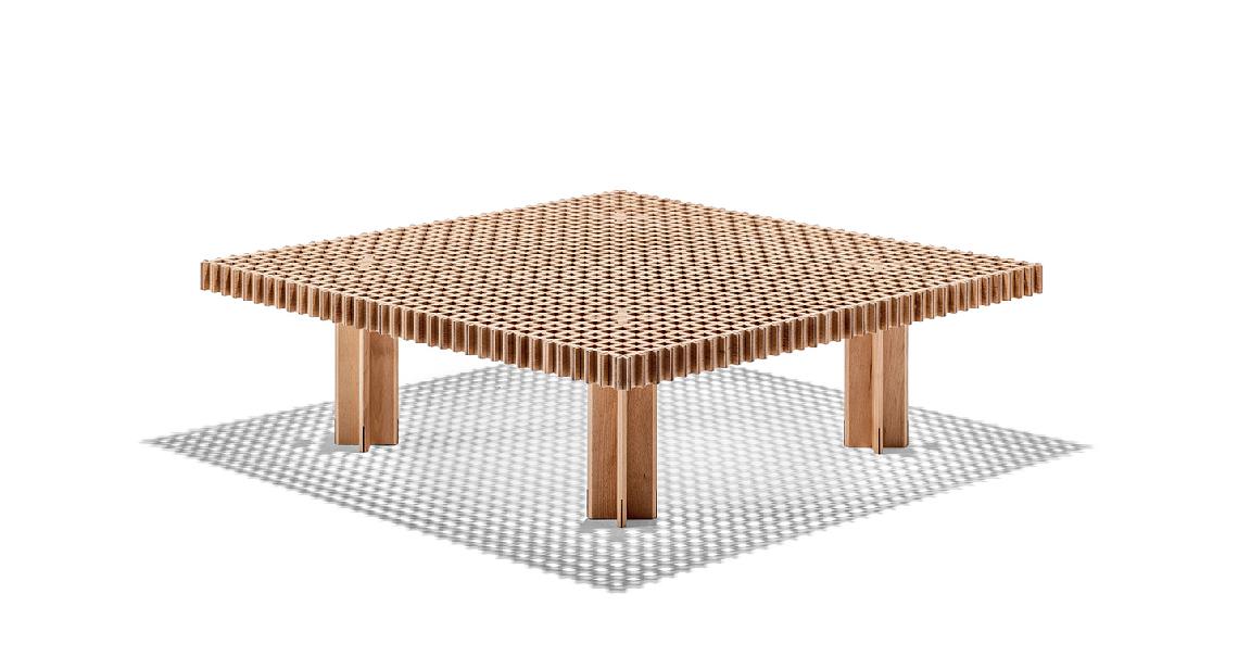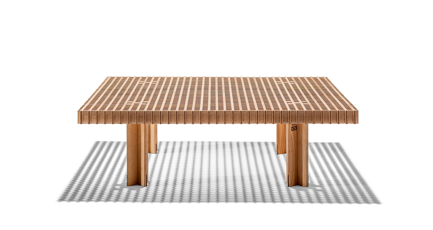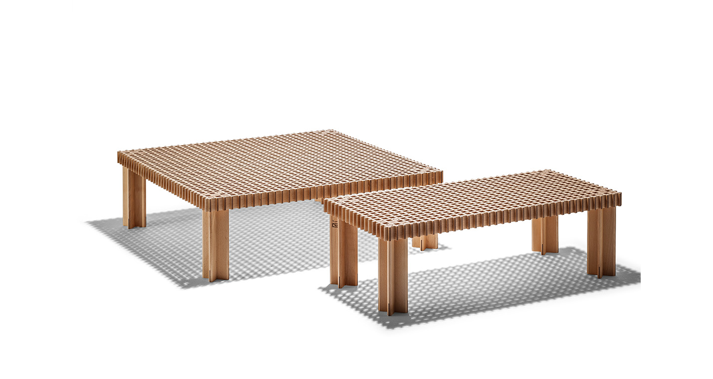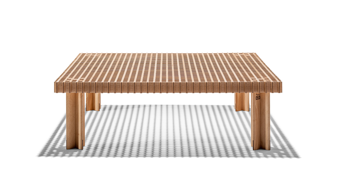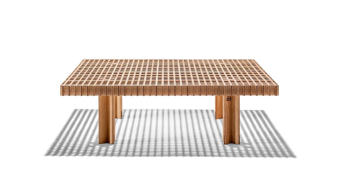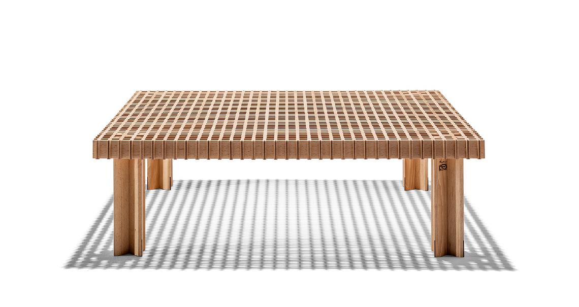 Kyoto桌提供方形版本,每邊102cm,高32cm,或102x49cm版本,依然高32cm。臺面結(jié)構(gòu)和桌腿使用超淺色櫸木實木,板條端部有卡納萊托胡桃木實木鑲嵌,構(gòu)成頂面。木板條45°榫接,形成方形編織。交錯式支柱可隨意移動和定位。