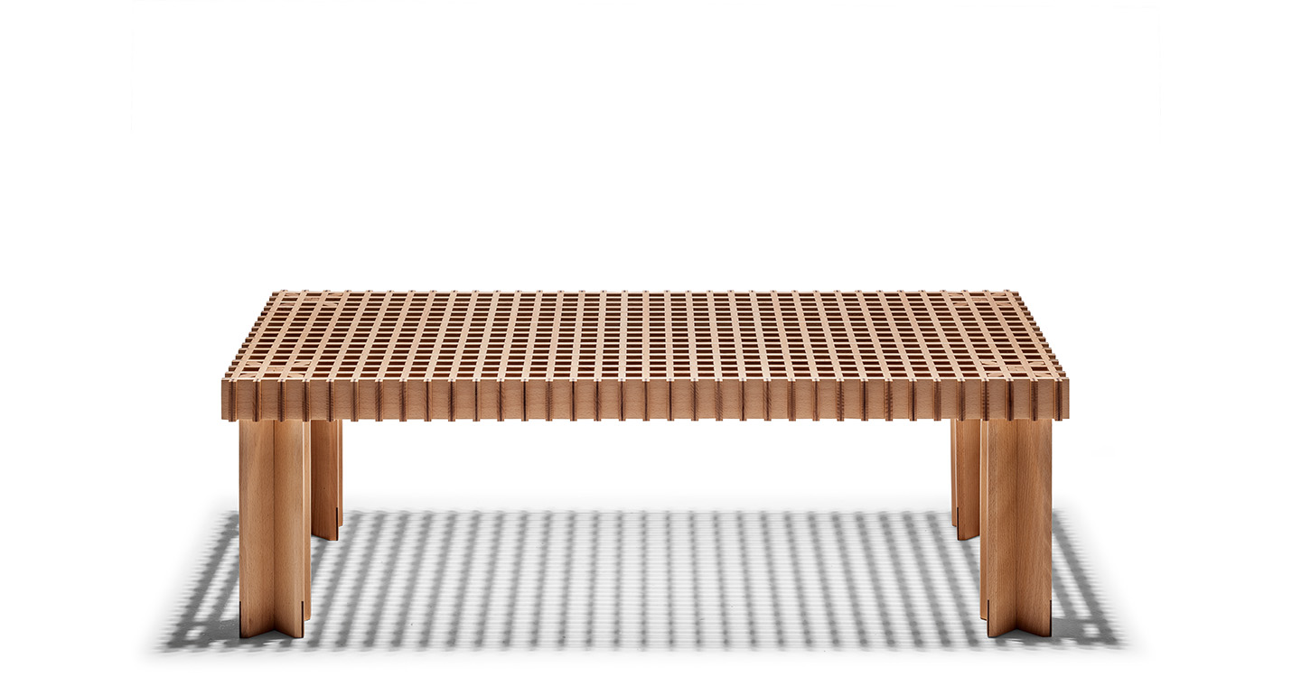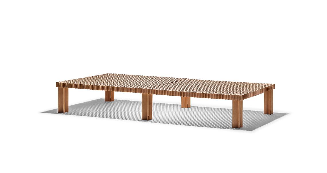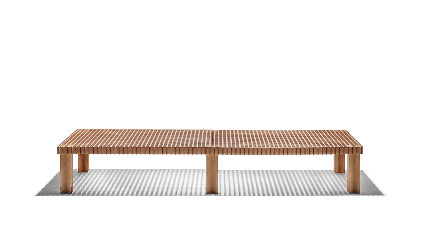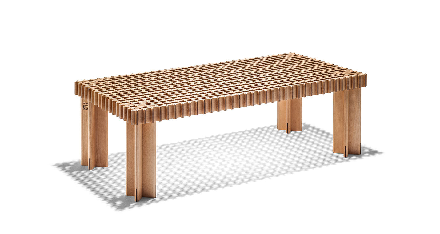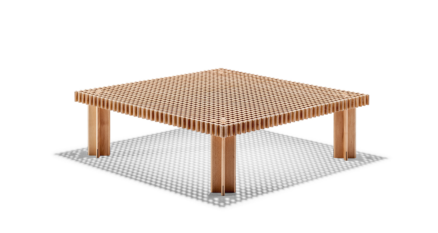 Kyoto桌提供方形版本,每邊102cm,高32cm,或102x49cm版本,依然高32cm。臺面結(jié)構(gòu)和桌腿使用超淺色櫸木實木,板條端部有卡納萊托胡桃木實木鑲嵌,構(gòu)成頂面。木板條45°榫接,形成方形編織。交錯式支柱可隨意移動和定位。