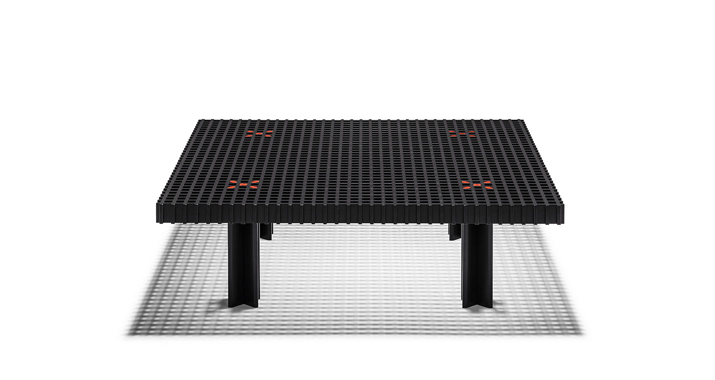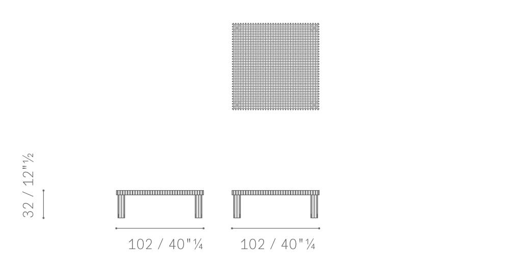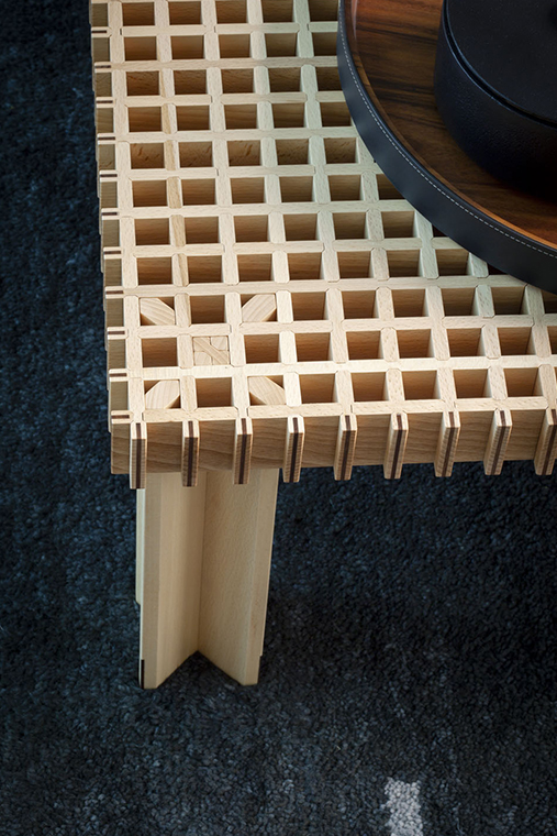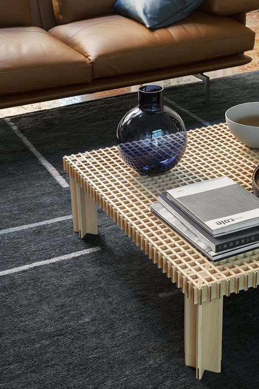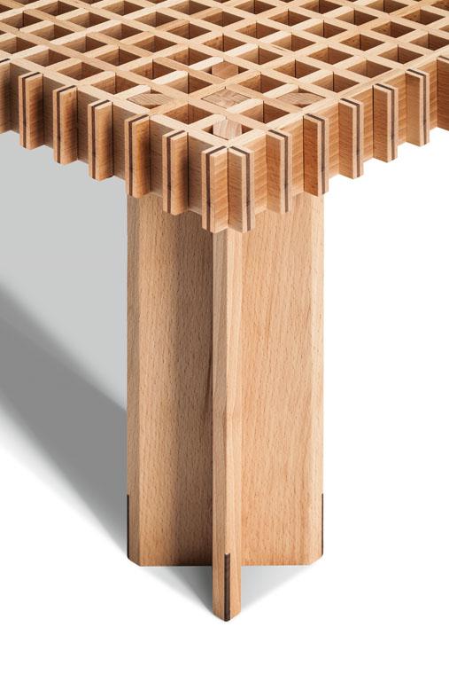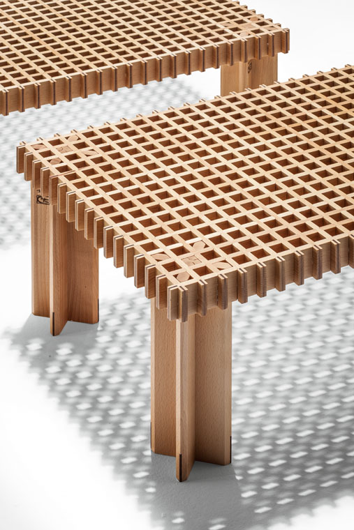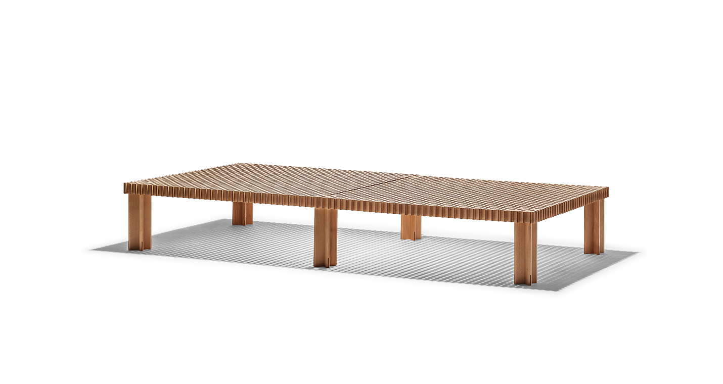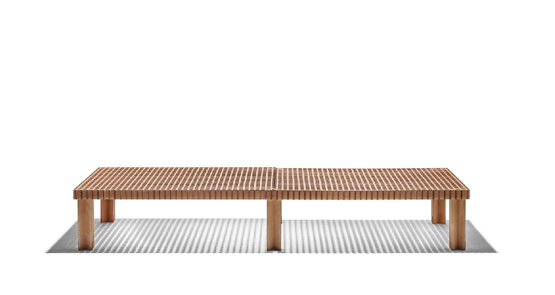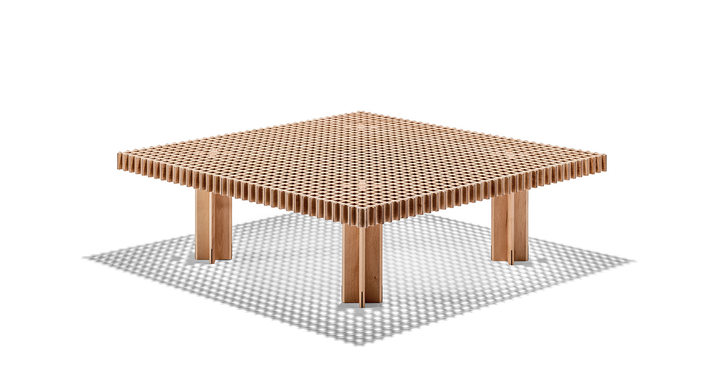 Kyoto桌提供方形版本,每邊102cm,高32cm,或102x49cm版本,依然高32cm。臺面結(jié)構(gòu)和桌腿使用超淺色櫸木實木,板條端部有卡納萊托胡桃木實木鑲嵌,構(gòu)成頂面。木板條45°榫接,形成方形編織。交錯式支柱可隨意移動和定位。