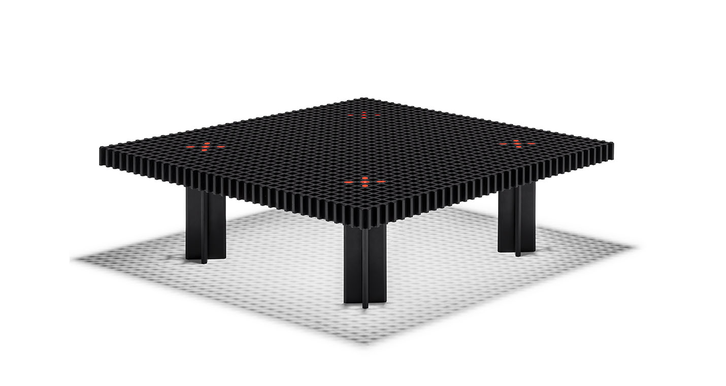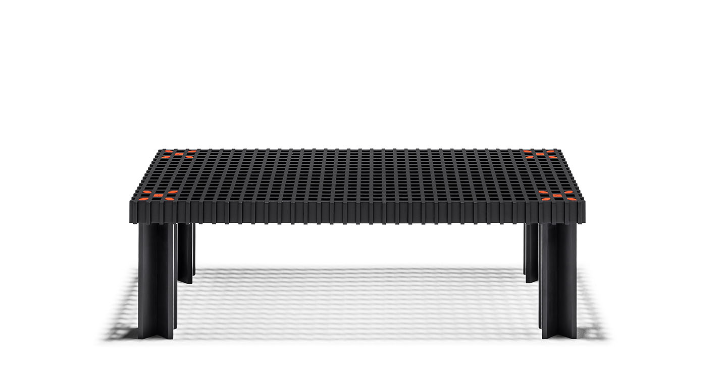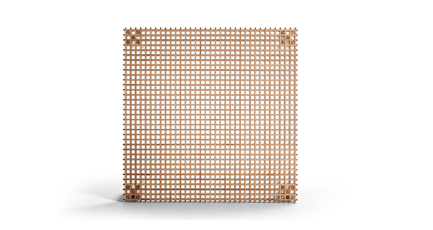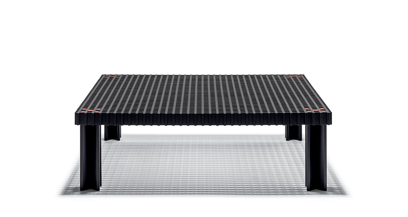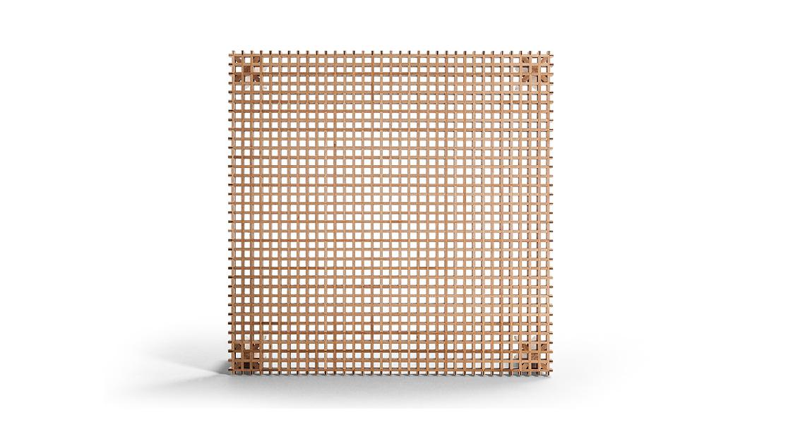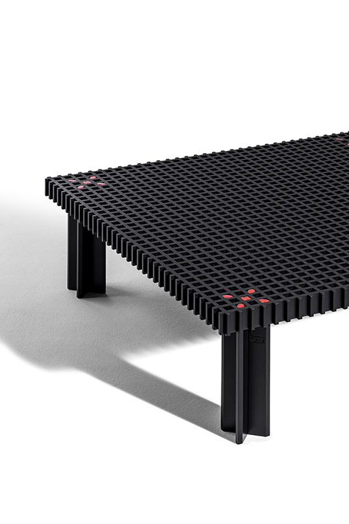 Kyoto桌提供方形版本,每邊102cm,高32cm,或102x49cm版本,依然高32cm。臺面結(jié)構(gòu)和桌腿使用超淺色櫸木實木,板條端部有卡納萊托胡桃木實木鑲嵌,構(gòu)成頂面。木板條45°榫接,形成方形編織。交錯式支柱可隨意移動和定位。