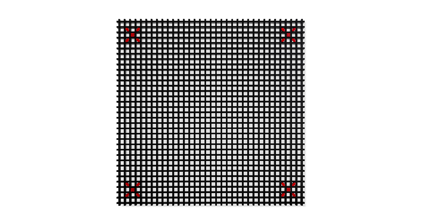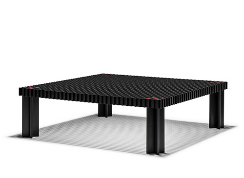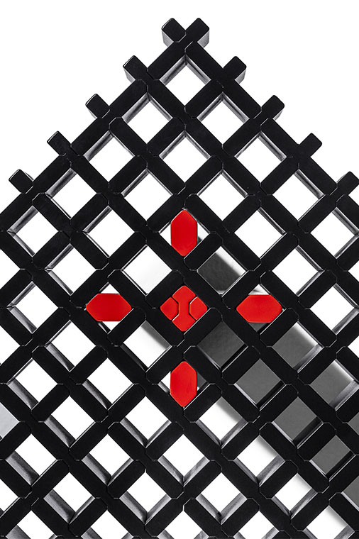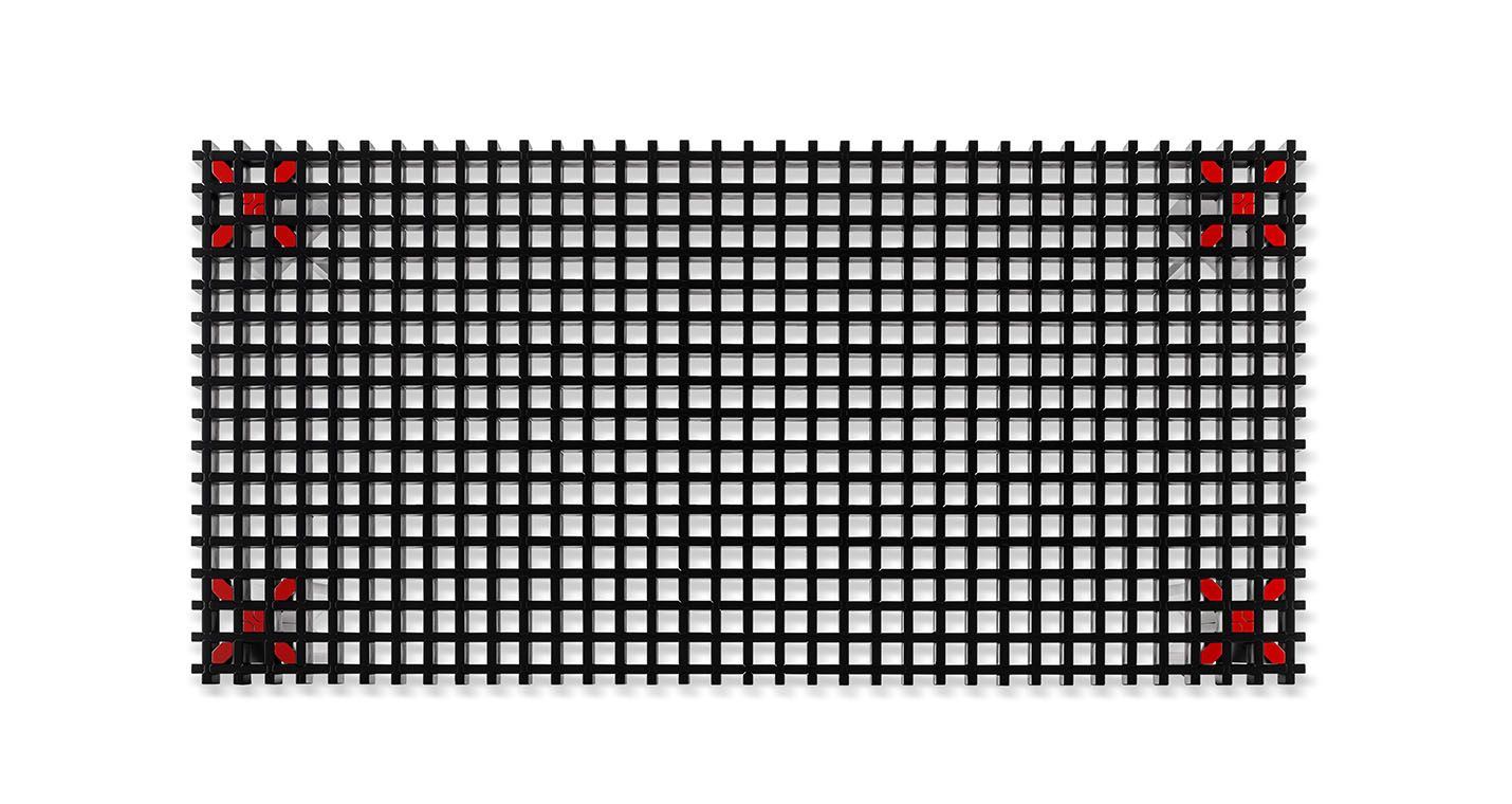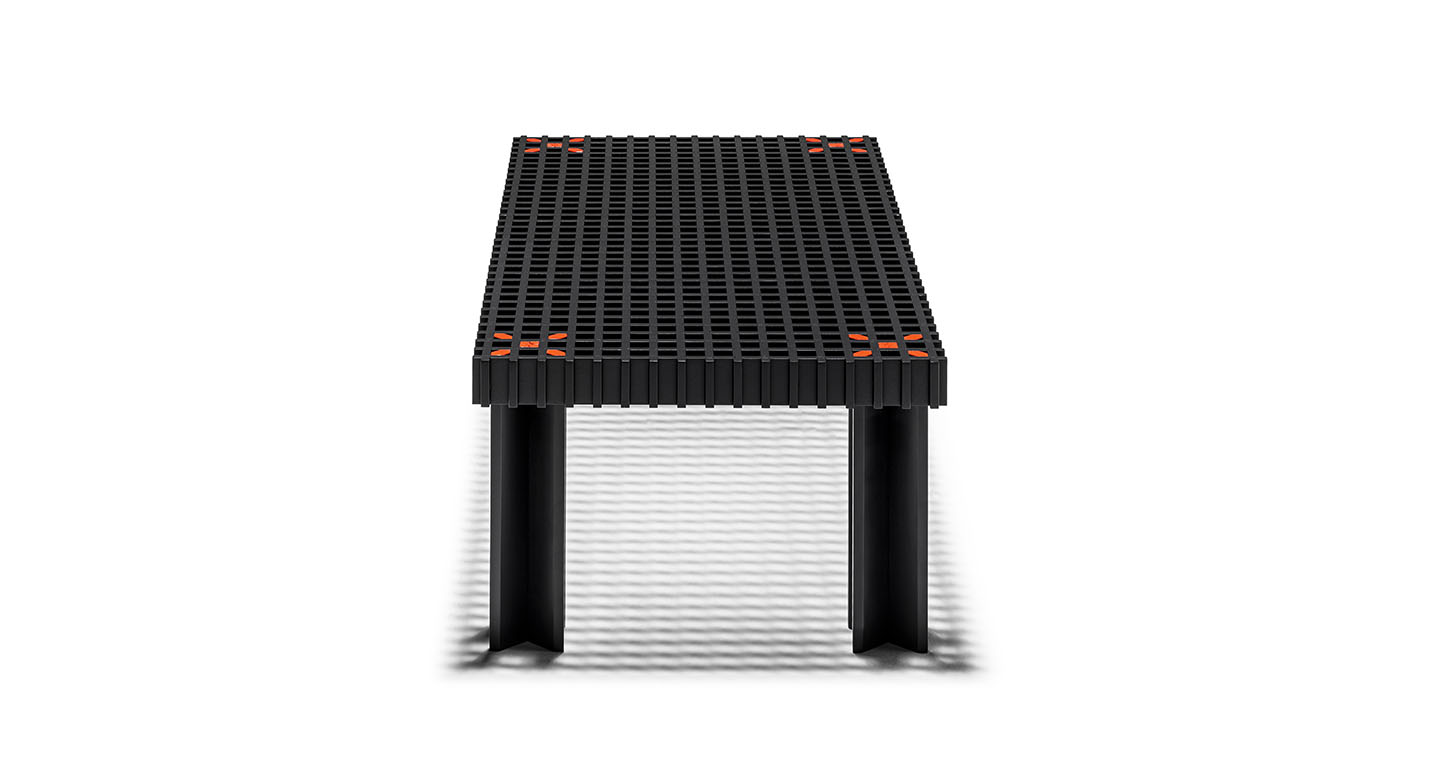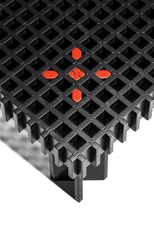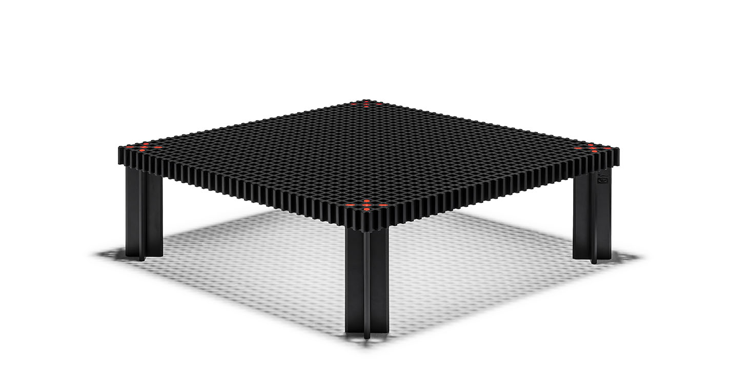 Kyoto桌提供方形版本,每邊102cm,高32cm,或102x49cm版本,依然高32cm。臺面結(jié)構(gòu)和桌腿使用超淺色櫸木實木,板條端部有卡納萊托胡桃木實木鑲嵌,構(gòu)成頂面。木板條45°榫接,形成方形編織。交錯式支柱可隨意移動和定位。