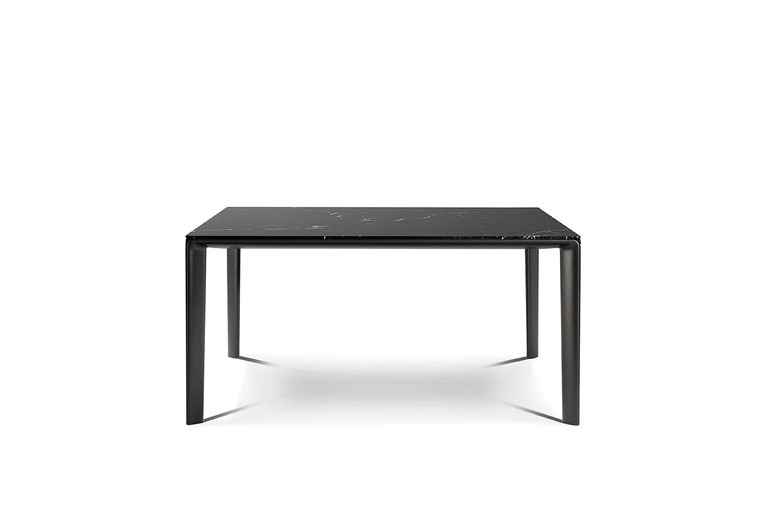 The Homey dining table designed by GamFratesi aims to shine a renewed light on the value of the home and emphasize the centrality of its role in domestic settings that are increasingly attentive to sharing. This designer table is compact and graphic, characterised by light but volumetric lines, enriched by fine and expertly worked materials. The quintessence of Homey is expressed in its die-cast aluminium legs. In a sculptural play reminiscent of haute couture, the two leg flaps fold and join together without touching, creating a chiaroscuro effect in the centre. A refined stylistic exercise that recalls the workmanship of leather, Poltrona Frau's material of choice. The lines of the two flaps open slightly at the top to transform into the shelf that supports it.