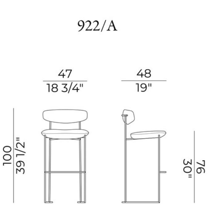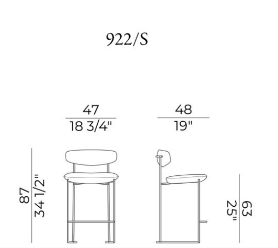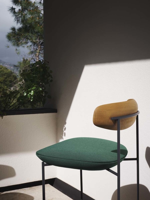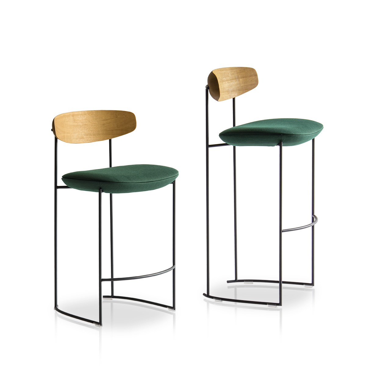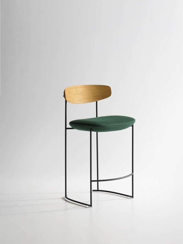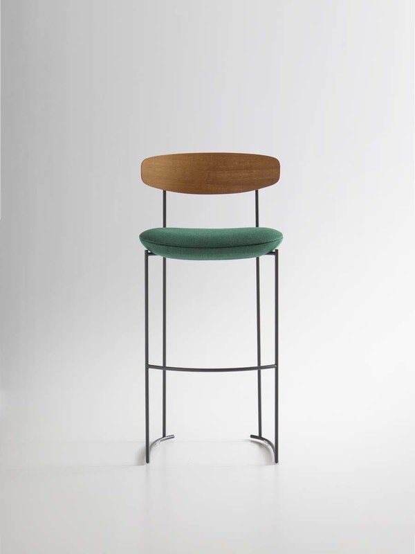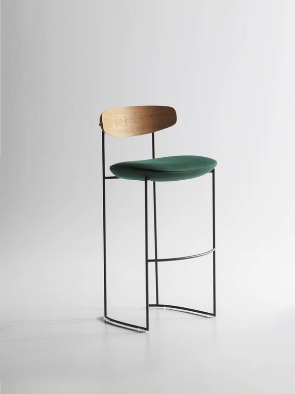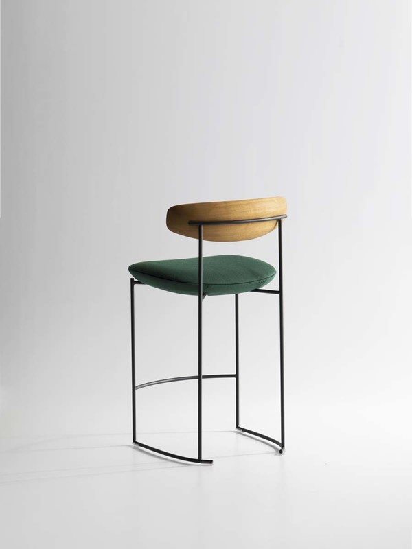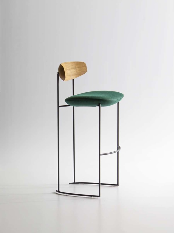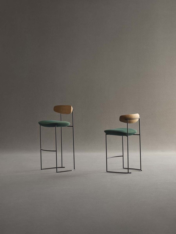 The Keel stools in two-heights, part of the homonymous collection consisting of chair, small armchair and armchair, have a linear structure in metal rod, an enveloping backrest in solid wood and padded, soft and sinuous support elements.
