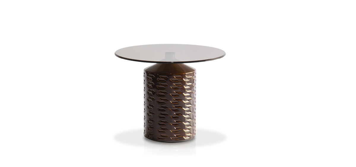 The base in ceramic, presented in the new Chocolate finish, characterized by a handcrafted geometric-patterned bas-relief decoration, which through the deposit of the crystalline creates refined chromatic effects, distinguishes the Hishi coffee tables' family.