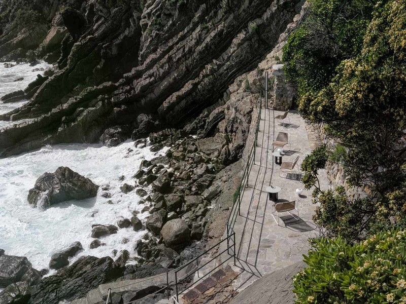 Connection between the bases in painted black metal and top in laminated porcelain or in light grey natural stone.