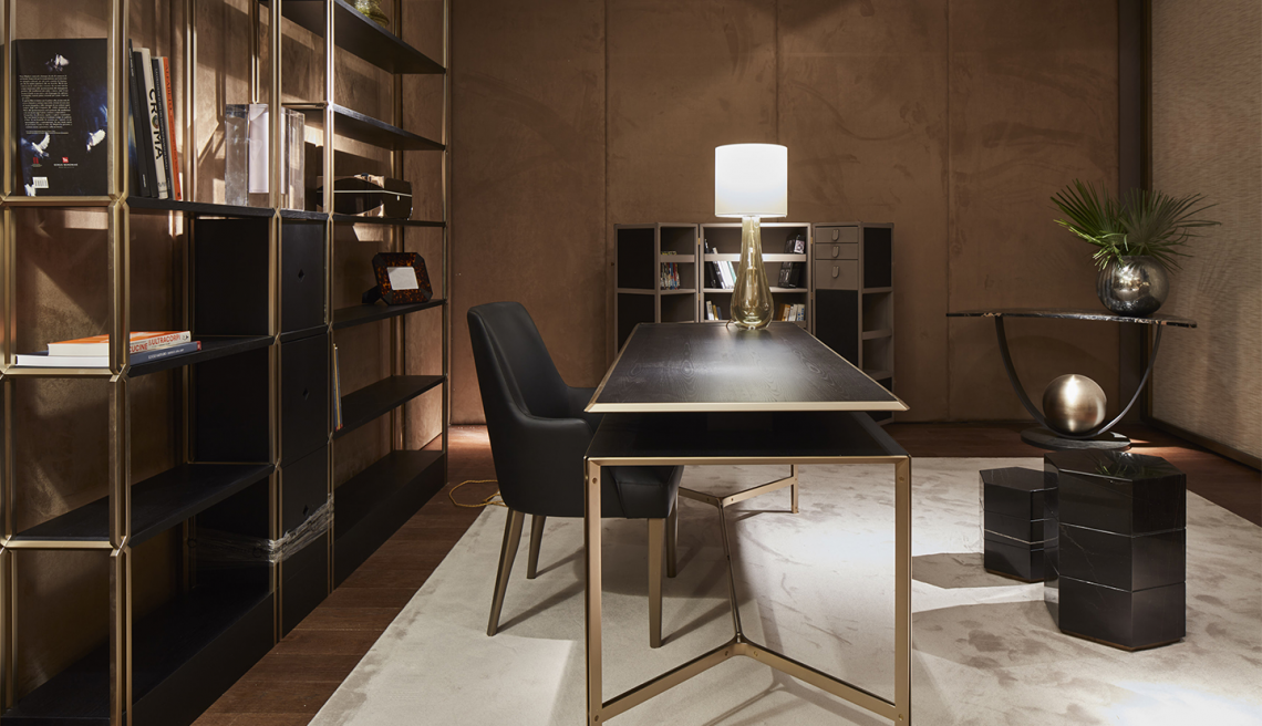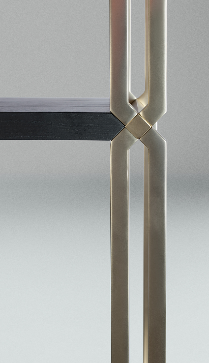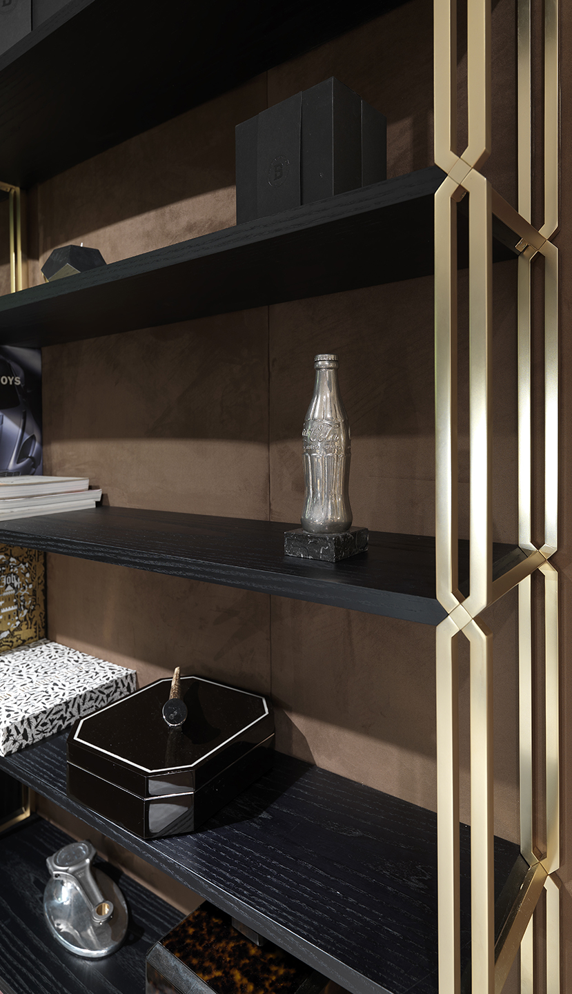 La libreria è composta da montanti intrecciati tra loro in acciaio con finitura oro opaco dipinta artigianalmente a sezione quadrata, che si incrociano a 45 gradi, formando un particolare disegno a croce. I ripiani e lo zoccolo sono rivestiti in essenza frassino black. Infine, la libreria si correda di 3 cassetti in legno, con la medesima finitura.