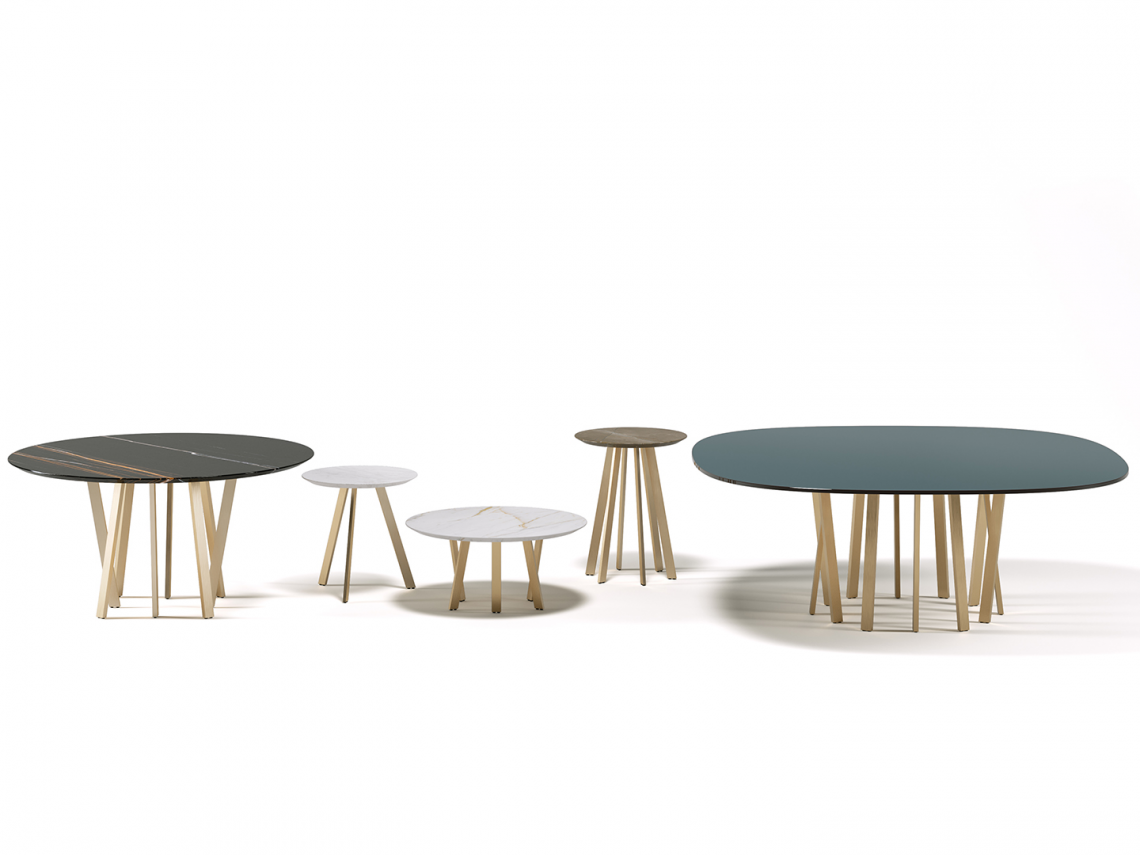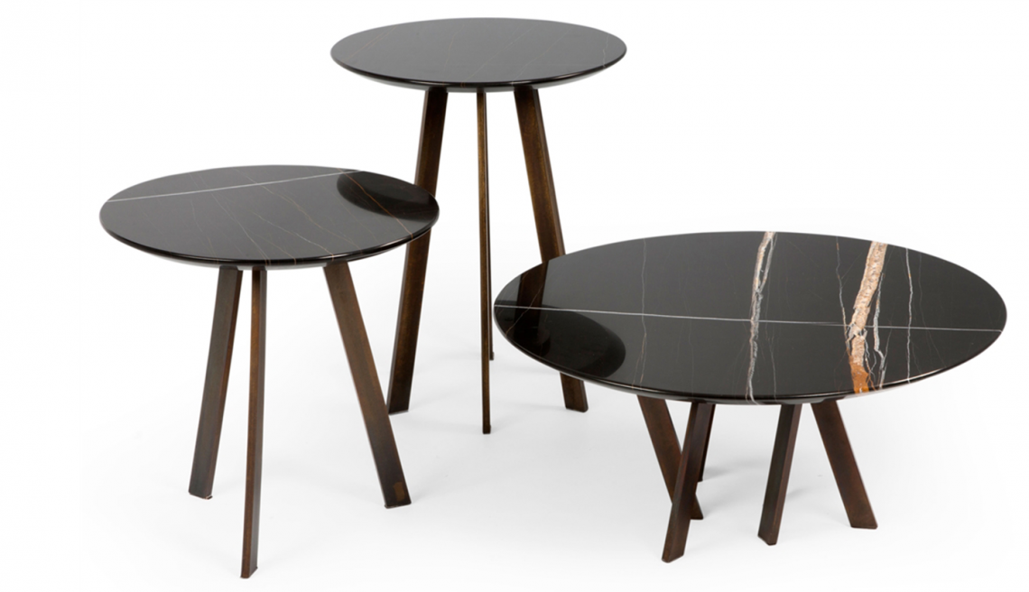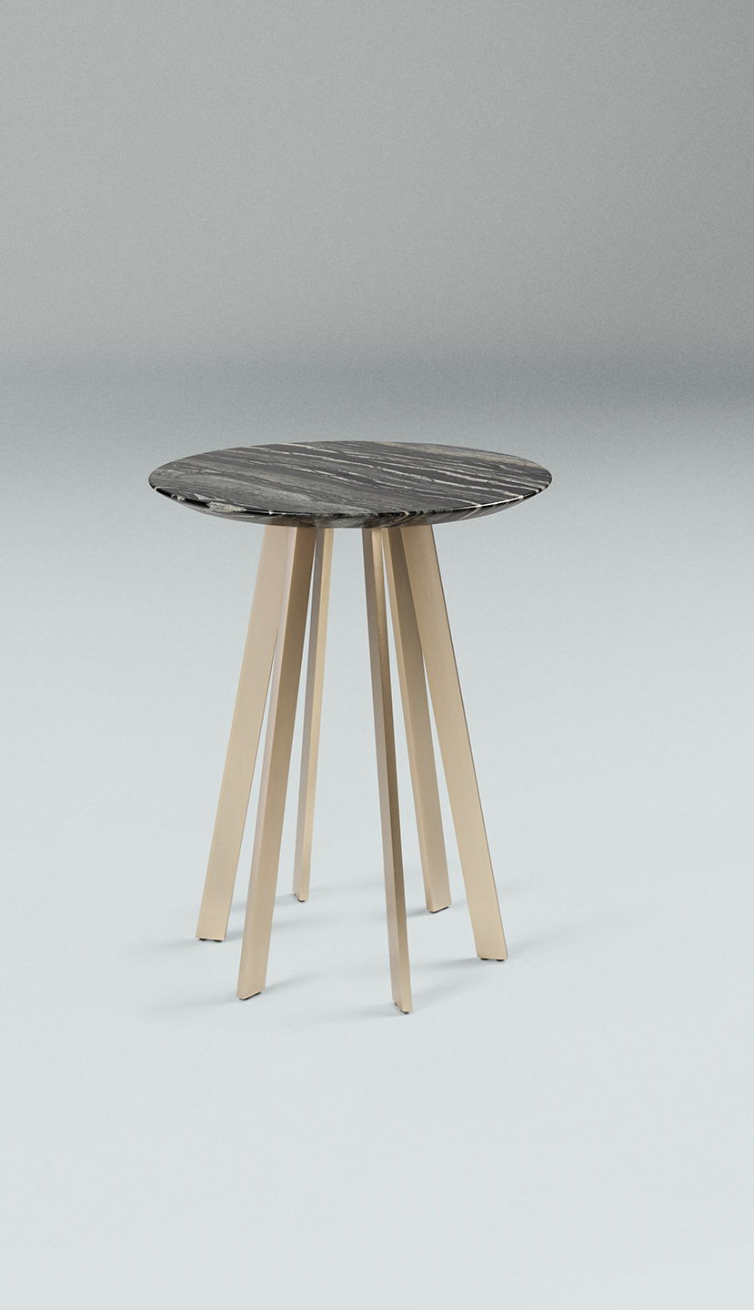 Sono composti da un piano realizzato in prezioso marmo e una base con gambe in metallo con finitura oro opaco. Il modello E è proposto anche con piano in vetro.