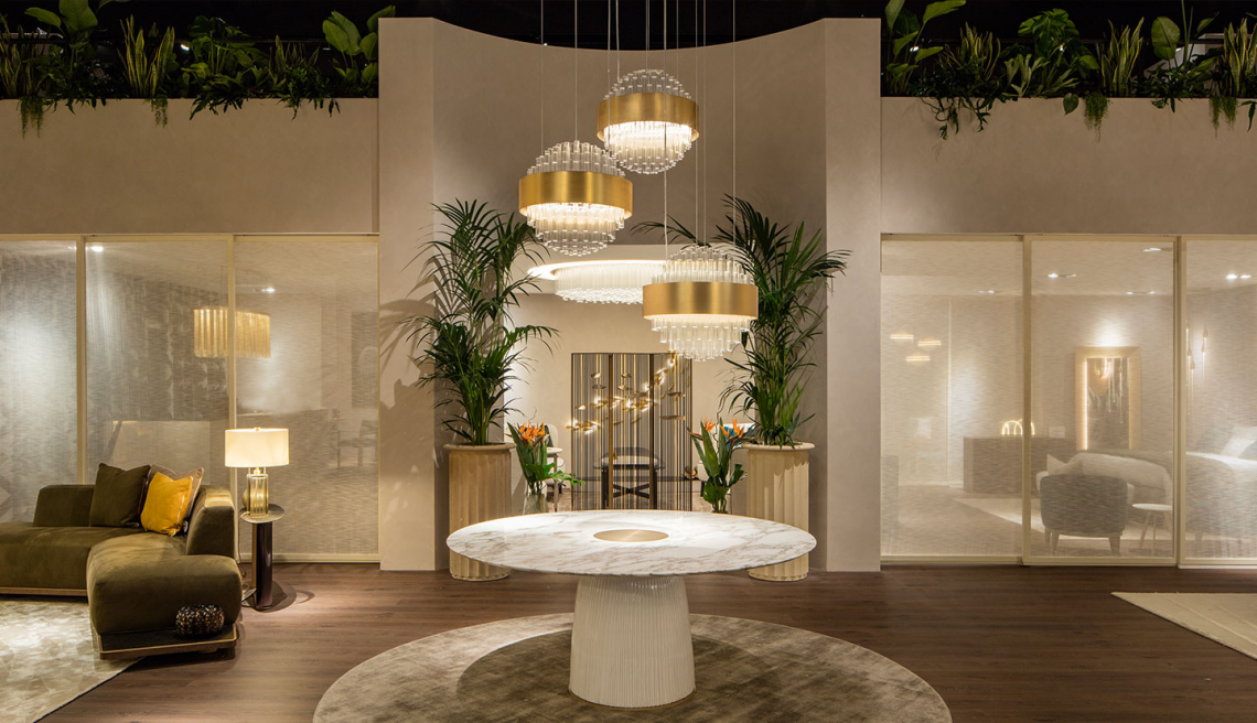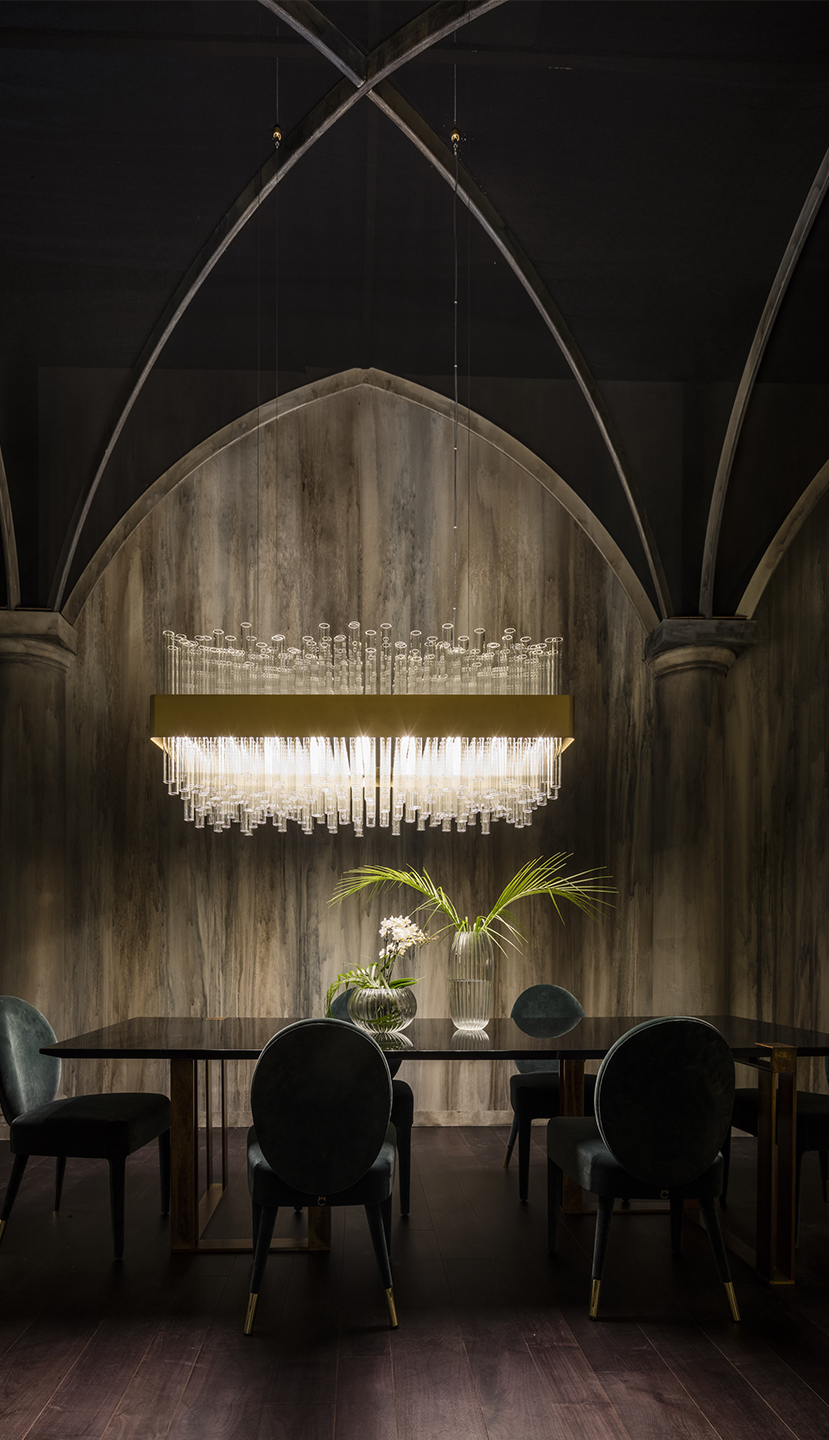 è composto da un importante bouquet di tubi realizzati in vetro borosilicato veneziano posti ad altezze sfasate e raccolti in una fascia metallica curvata, trattata con particolare finitura a più strati oro opaco. Il telaio portante interno è realizzato in metallo nichelato. Contropiastra opalescente per diffondere la luce.