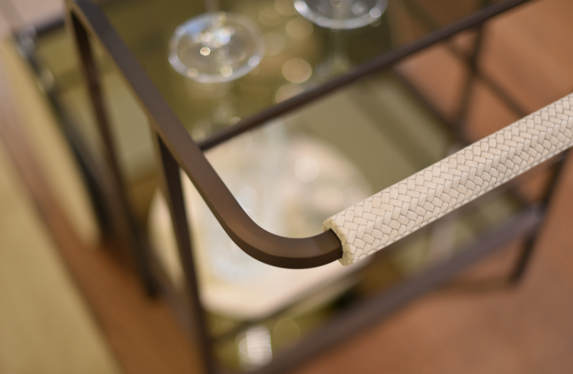 Carrello utilizzabile come mobile bar e tavolino. La struttura è in metallo con finitura bronze shadow opaco, il ripiano superiore è in vetro trasparente col. avana e quello inferiore è in vetro specchiato satinato col. bronzo. Le ruote sono rivestite in nabuck con pattern ad intrecci, colore 15 taupe, come la maniglia.