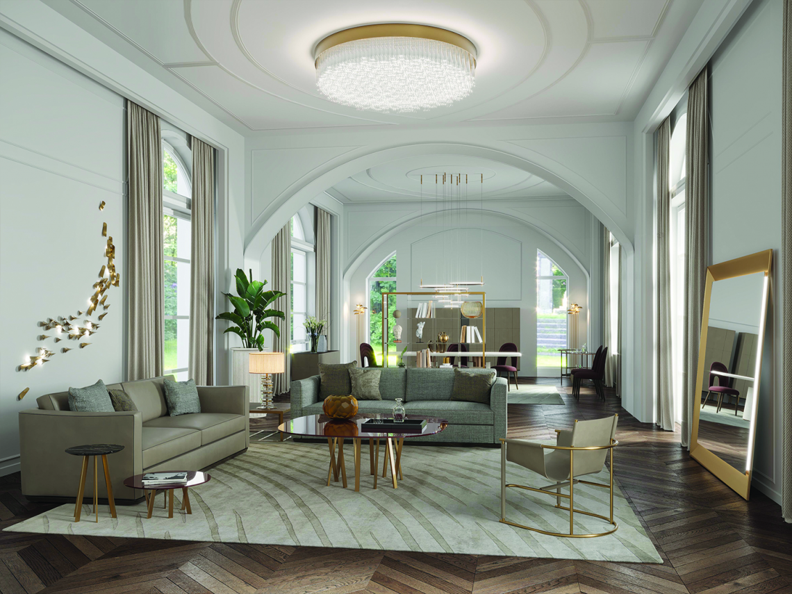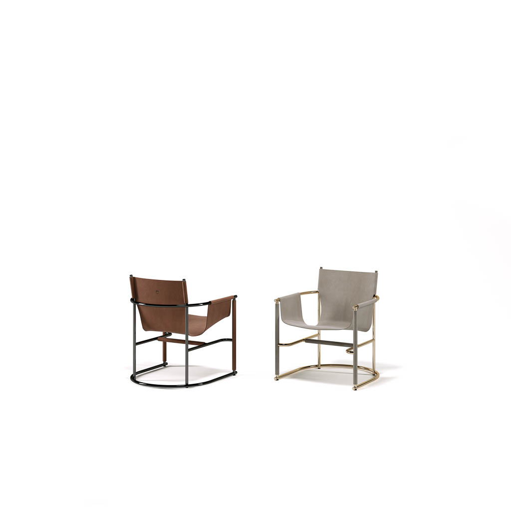 La struttura, che avvolge elegantemente il corpo, è disponibile in finitura lucida nichel nero oppure oro, con rivestimenti in cuoio color beige, naturale o nero, e cuciture a vista. La seduta invece appare come sospesa, fluttuante, poiché semplicemente calzata nello schienale e infilata nei braccioli. Braccioli in cuoio in tinta con i rivestimenti della struttura.