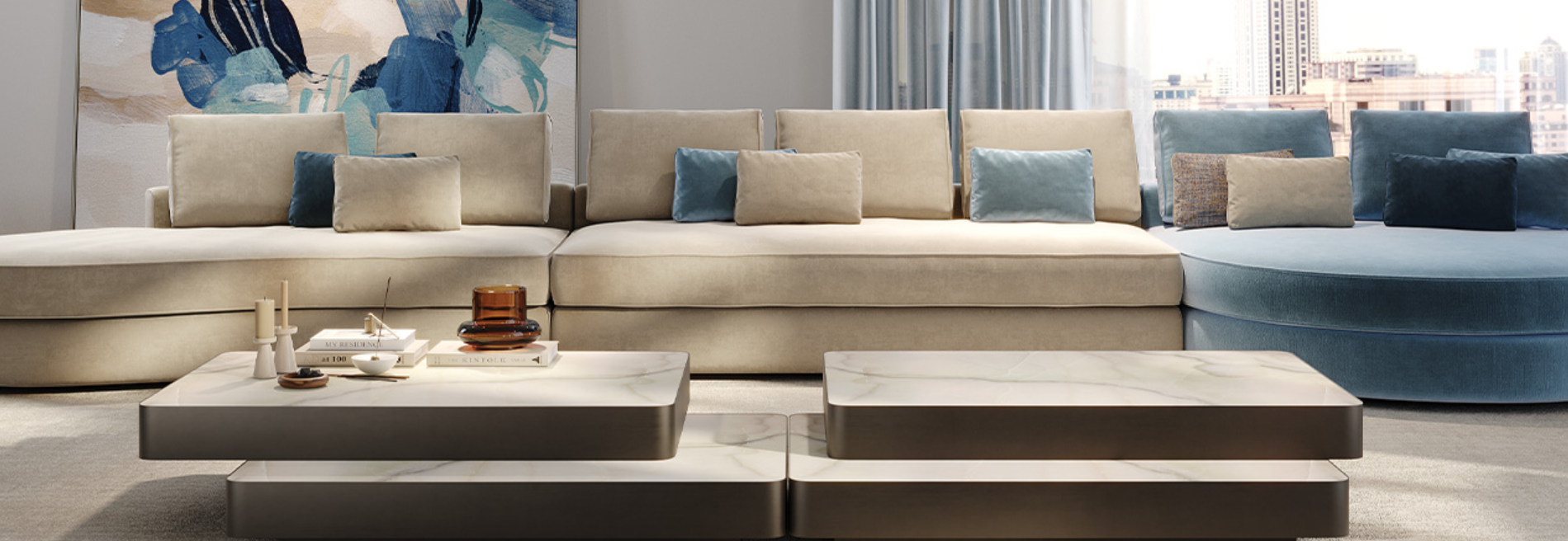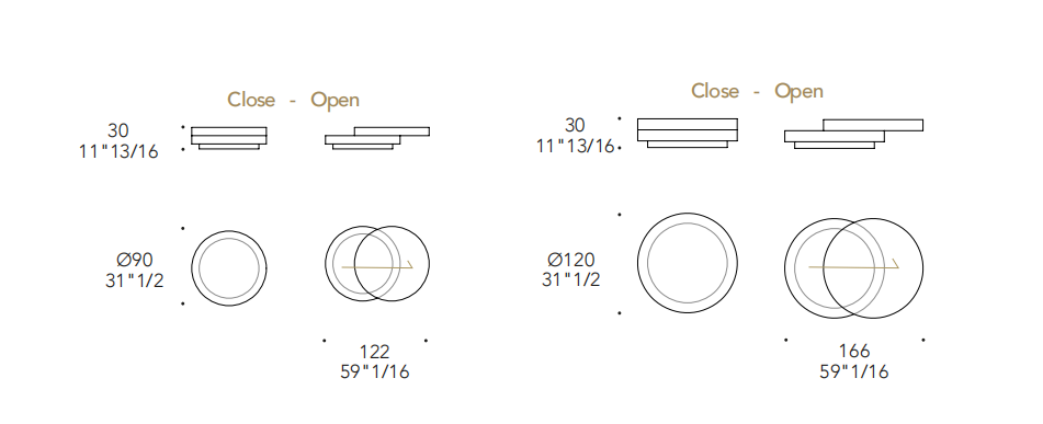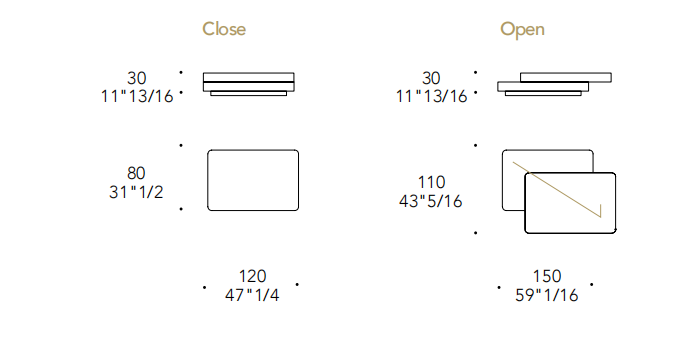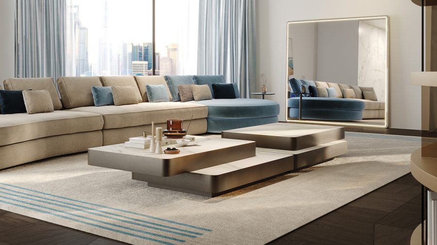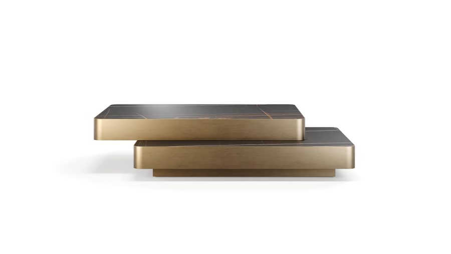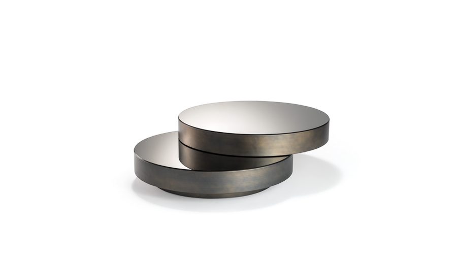 Tavolino con doppio piano, uno fisso e uno scorrevole. Struttura in bronze 100M, ottone 104M, ottone dark 105M o titanium 101M. Zoccolo in bronze 100M. Entrambi i piani o in MarmoReflex/LegnoReflex o in vetro a specchio fumè.