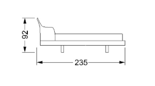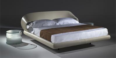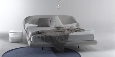Bed with curved headboard and sides upholstered in fabric or in leather.