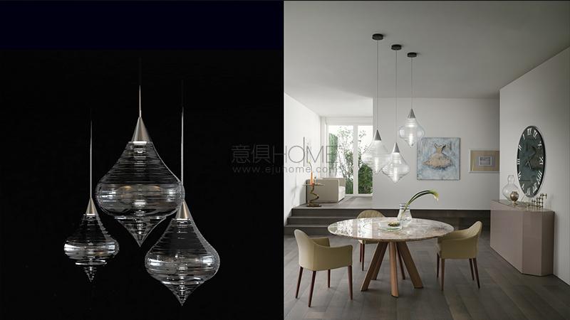 Pendant lamp in blown transparent Murano glass with black lacquered ceiling support. LED light.