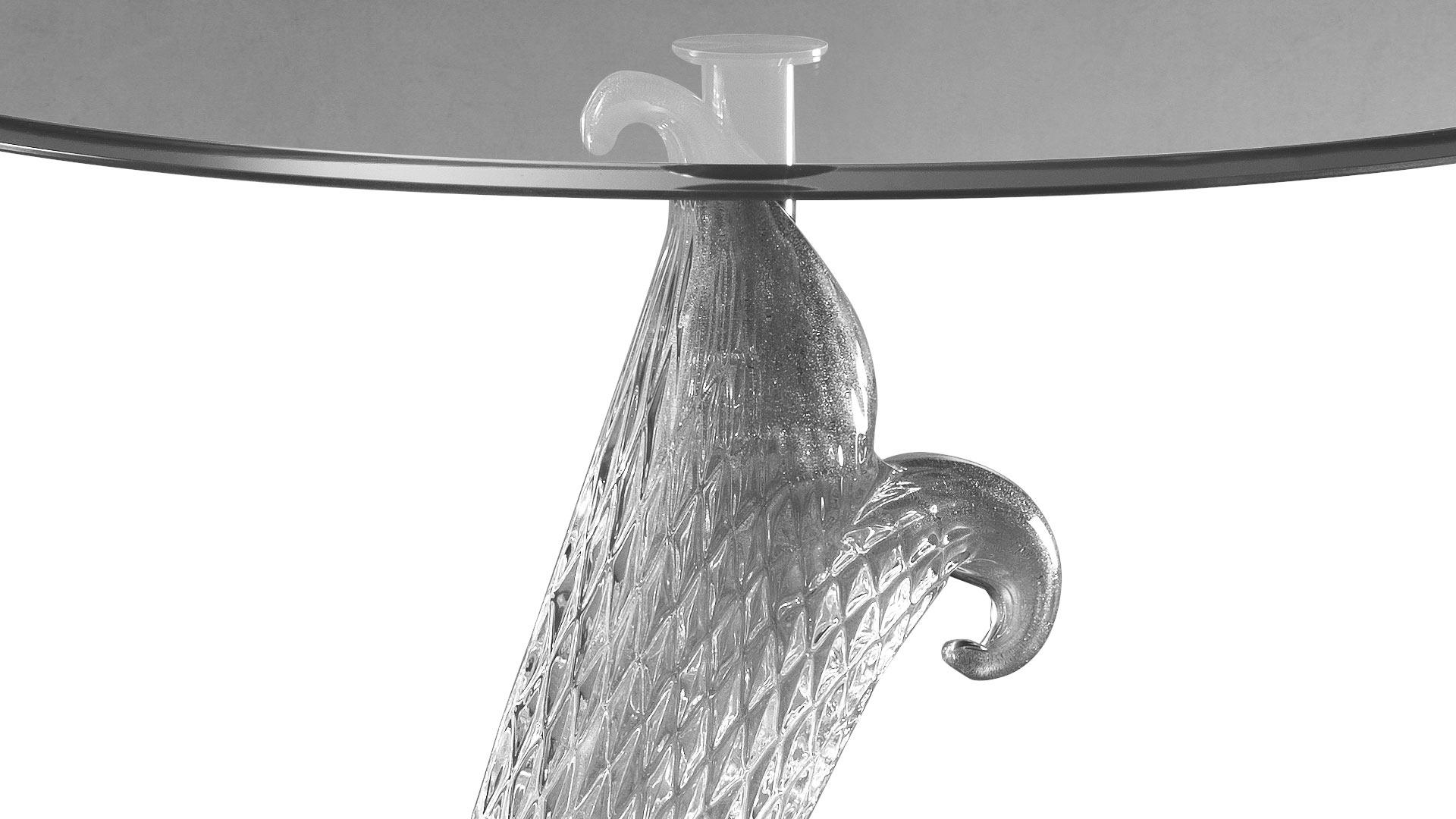 Side table in transparent or fine gold Murano glass on base in smoked mirror. Top in extraclear glass with 45° bevel.