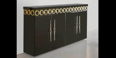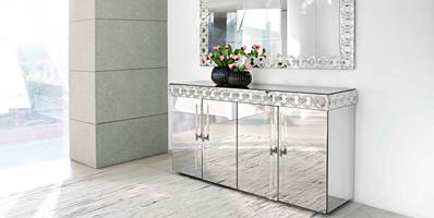 Sideboard with external covering in mirror glass or in lacquered glass. Decoration with transparent, gold or coloured Murano glass rings. Internal back and shelves in cedar-wood. Optional Murano glass handles and LED lighting on the decoration.