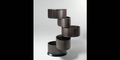 Chest of 5 drawers in curved wood in matt or shiny lacquered or in matt Ebony. Top in lacquered glass and leather cat.C details between the drawers. Also available in a leather cat.C, Nabuk, Colorata, Dune version, with top in lacquered glass in same colour. Details between the drawers in satin Brass (104M) or Titanium (101M) finish.