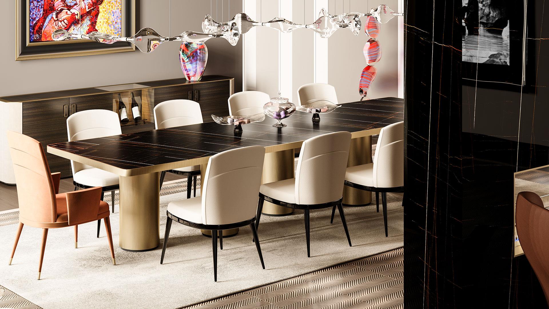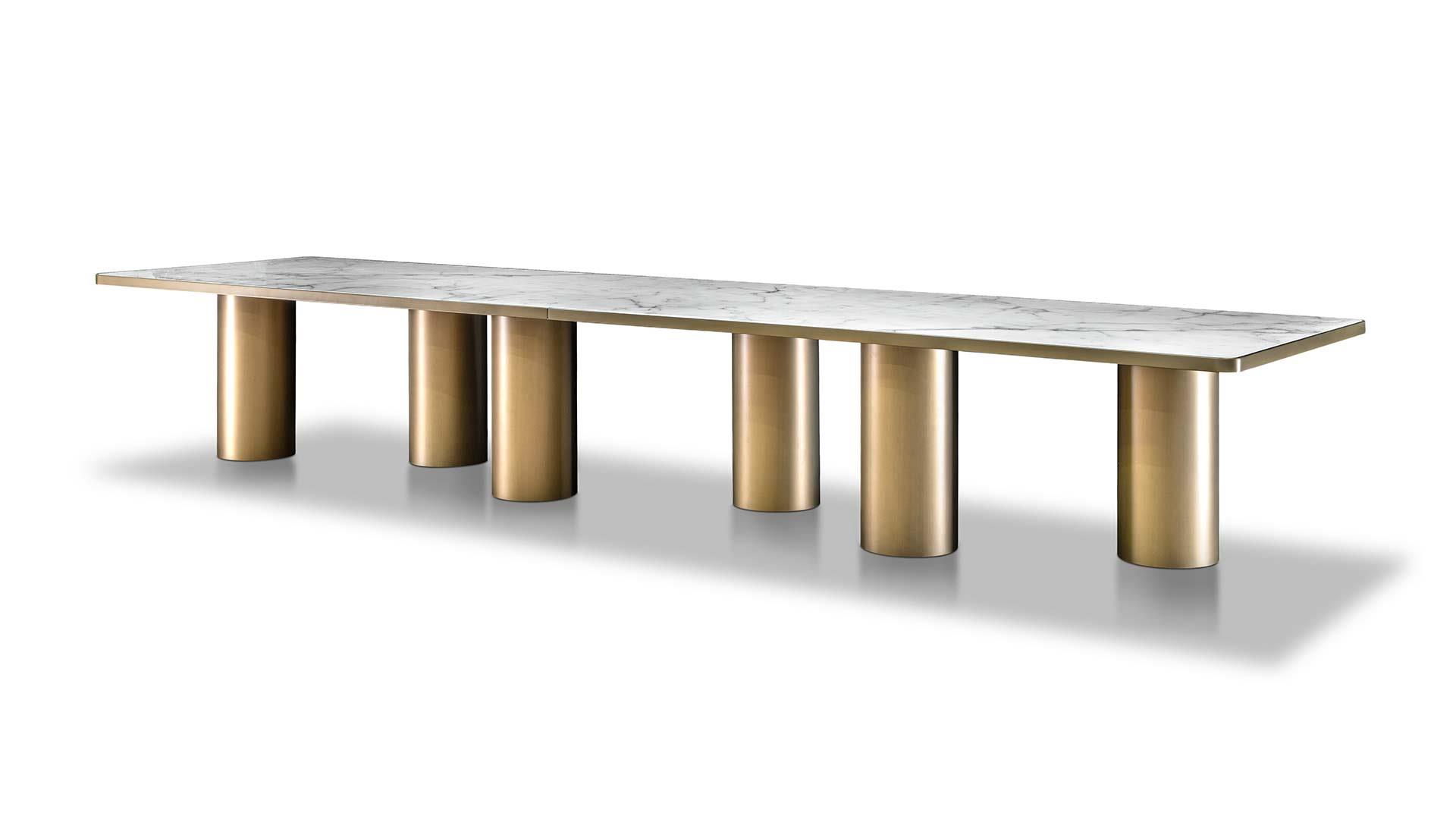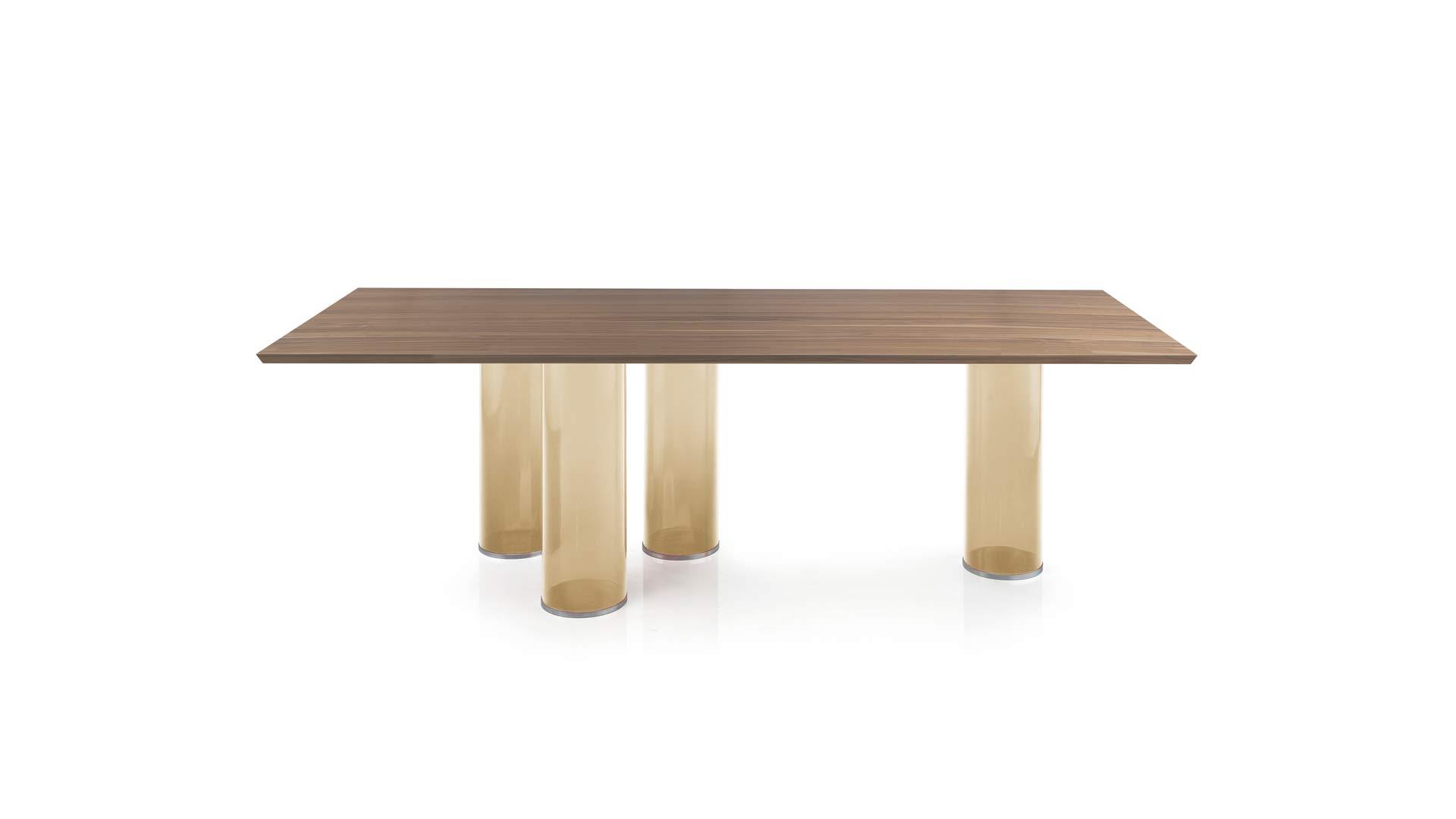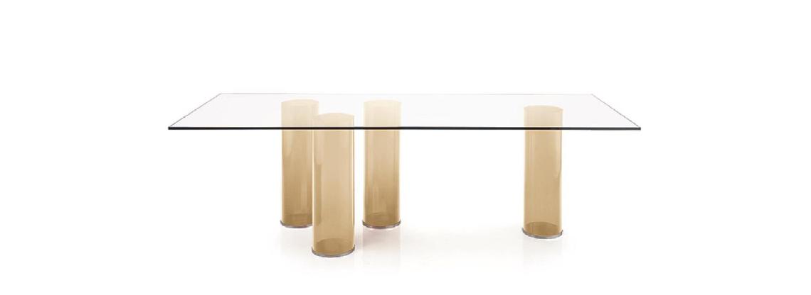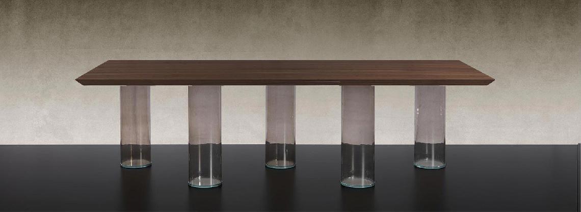 Dining table with base composed by Murano glass cylinders transparent, red, blue, aquamarine, amber, tobacco or amethyst. Top available in transparent glass top 15 mm thick, in Marble glass or in Bevel Wood.