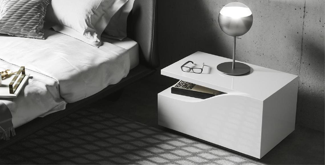 Night-stand in shiny lacquered wood or in oakwood with Henné, Miele or Beluga finish. 1 drawer with shaped wooden front and a open compartment.