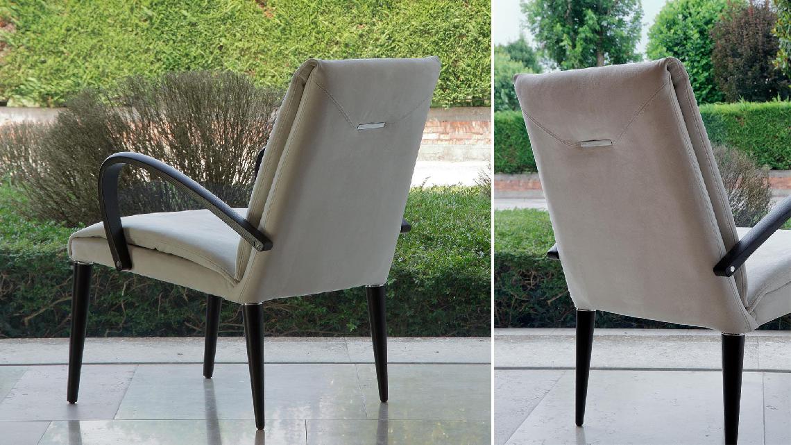Armchair with internal metal structure and upholstery in leather, velvet or fabric. Shiny steel detail on the back. Legs in shiny nero beluga lacquered wood, Canaletto walnut or matt beluga Oakwood. Also available with wooden arms in Canaletto walnut or Beluga oakwood