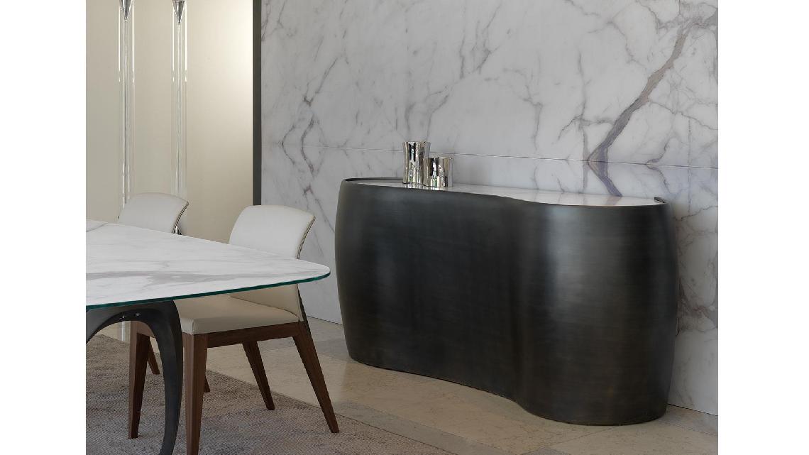 Shaped sideboard/bar cabinet in matt lacquered finish or in satin brass or titanium finishes. Top in Marble glass. Electrical lifting system with remote-control to pull out the internal storage unit equipped with glass shelves and bottle-holders.