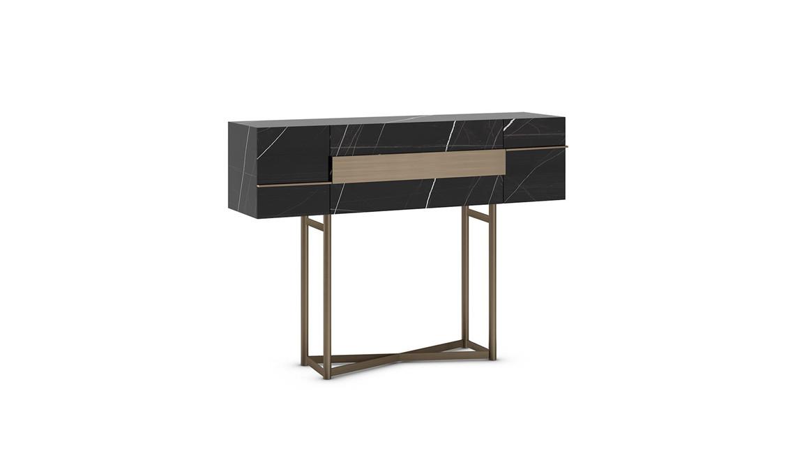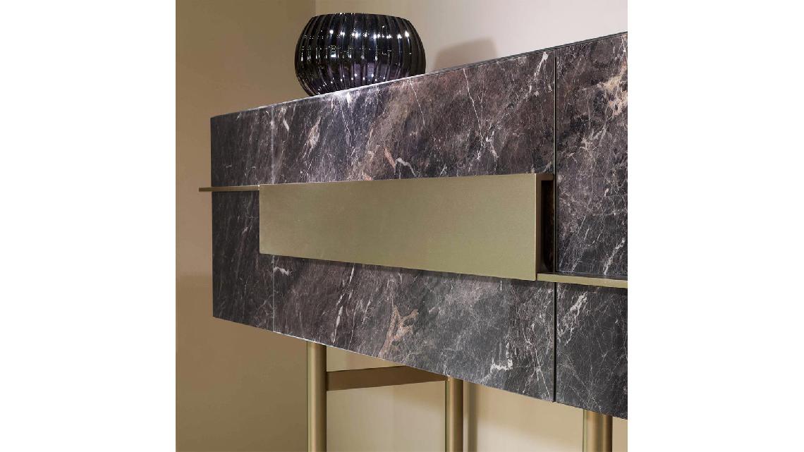 Sideboard with wooden structure covered in Marble glass. Handle details and metal base in Bronze finish.