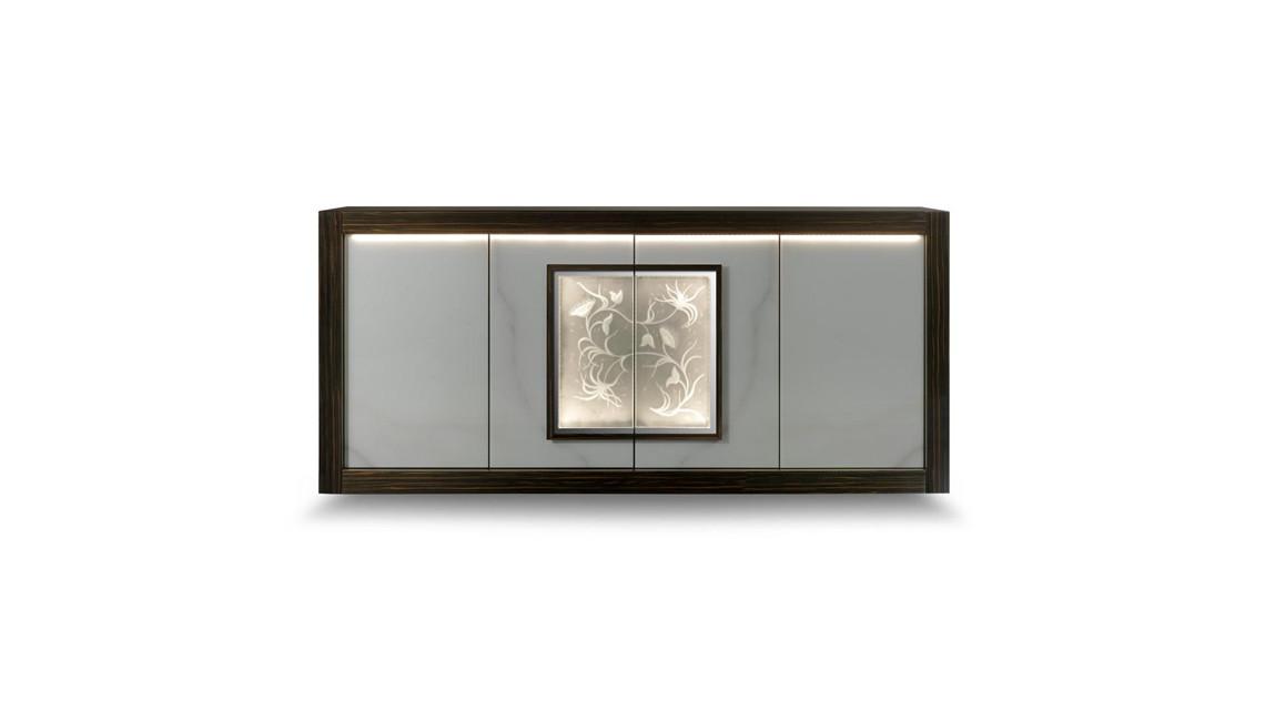 Sideboard with LED lighting under the top. Structure in shiny lacquered wood with application of bevelled lacquered glass or in shiny ebony wood. Doors covered in lacquered glass or in Marble glass. Glass tile with artistic engravings on the central doors