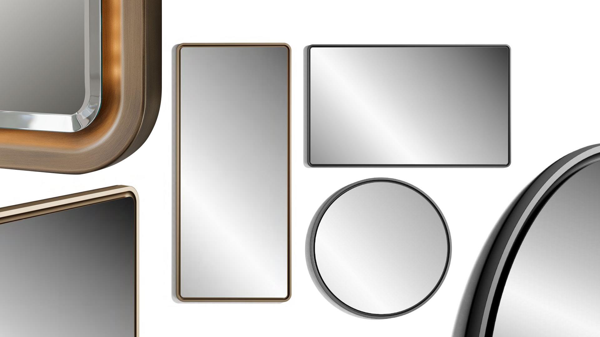 Collection of mirrors in extra clear 5mm thick glass with shaped wooden frame in the satin brass or titanium metallic finishes.Optional LED lighting.