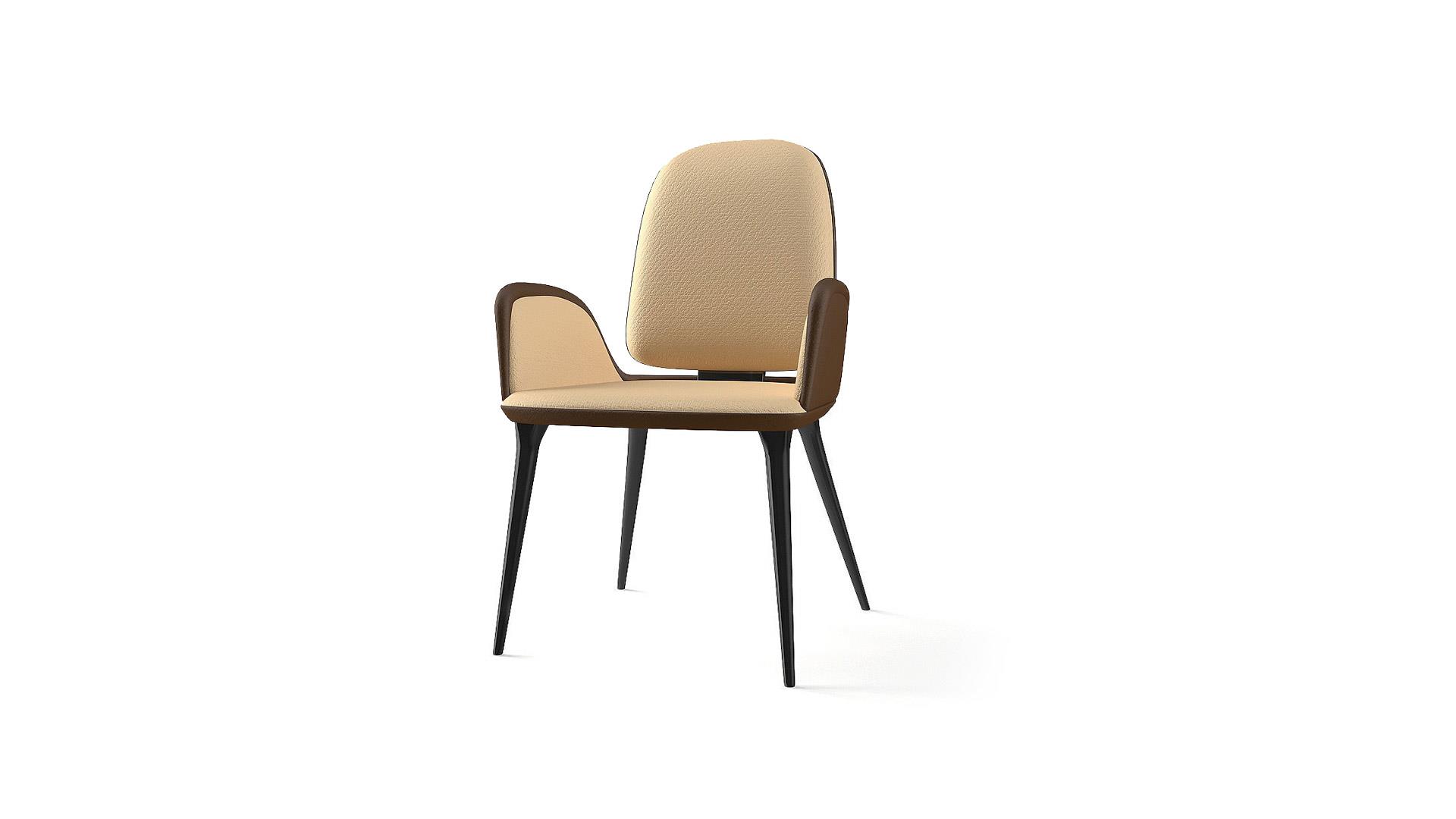Chair with padded wooden structure. Upholstery available in fabric or leather.Wooden legs in oakwood Beluga or in satin dark brass finish.Profile of the armrests in satin dark brass.