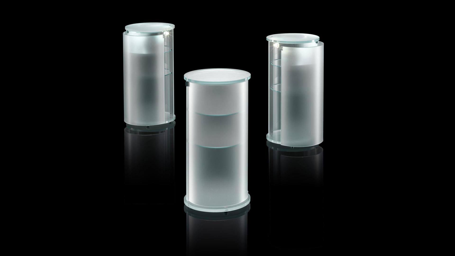 Side table in curved extra-clear frosted glass, right or left side opening. Equipped with two glass shelves and lighting system.