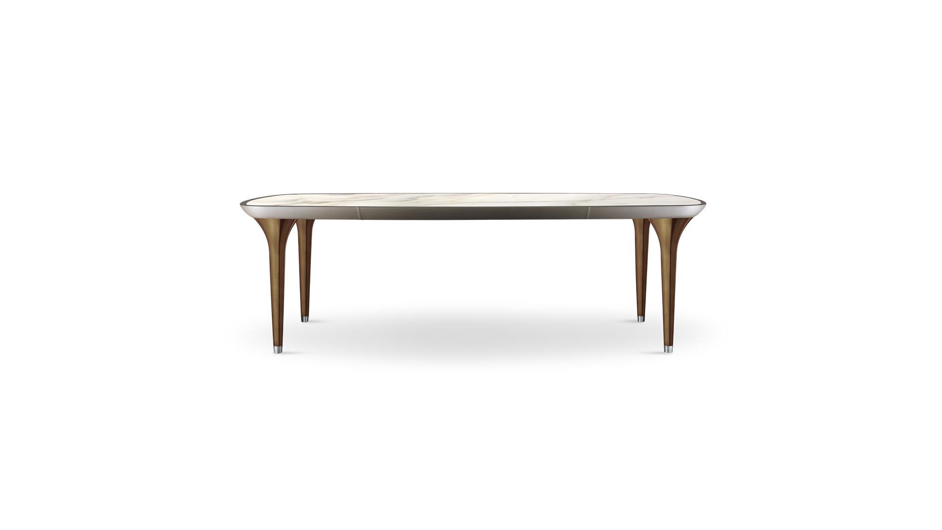 Dining table with 80mm thick wooden top with edges covered in leather. Top cover available in Canaletto walnut, shiny ebony wood, etched lacquered glass, Mesh glass, Marble-glass or in marble. Available also in round version with 40mm thick wooden top with shiny steel details in Canaletto walnut, shiny Ebony wood;or in shiny lacquered finish and a built-in Lazy Susan in etched lacquered glass, Mesh glass, Marble glass or in marble. Legs in black or pearl-grey Murano glass with glazed metal feet.