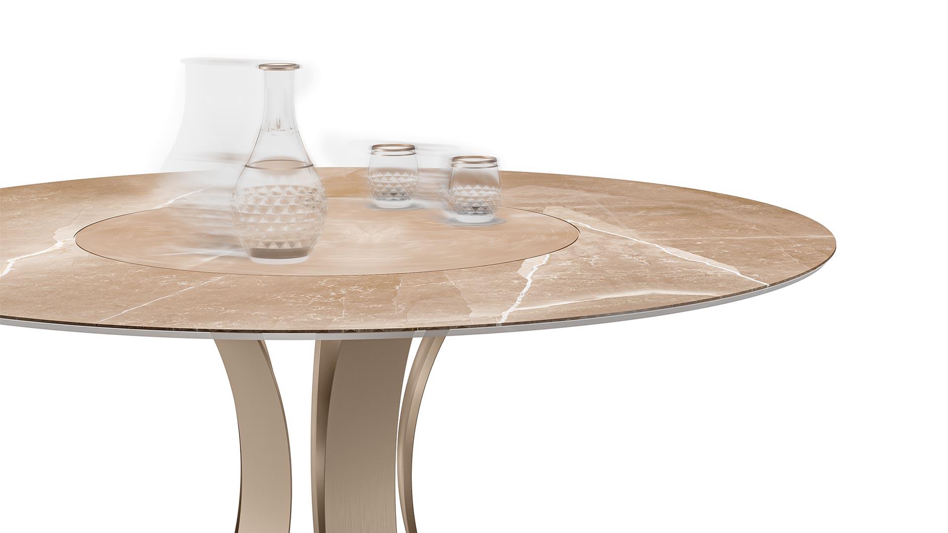 Dining table with base composed by curved legs and bottom disc in extra clear with Bronze or SunbronzeTop with built-in Lazy Susan in Marble glass 4+10mm thick, Wing edge.
