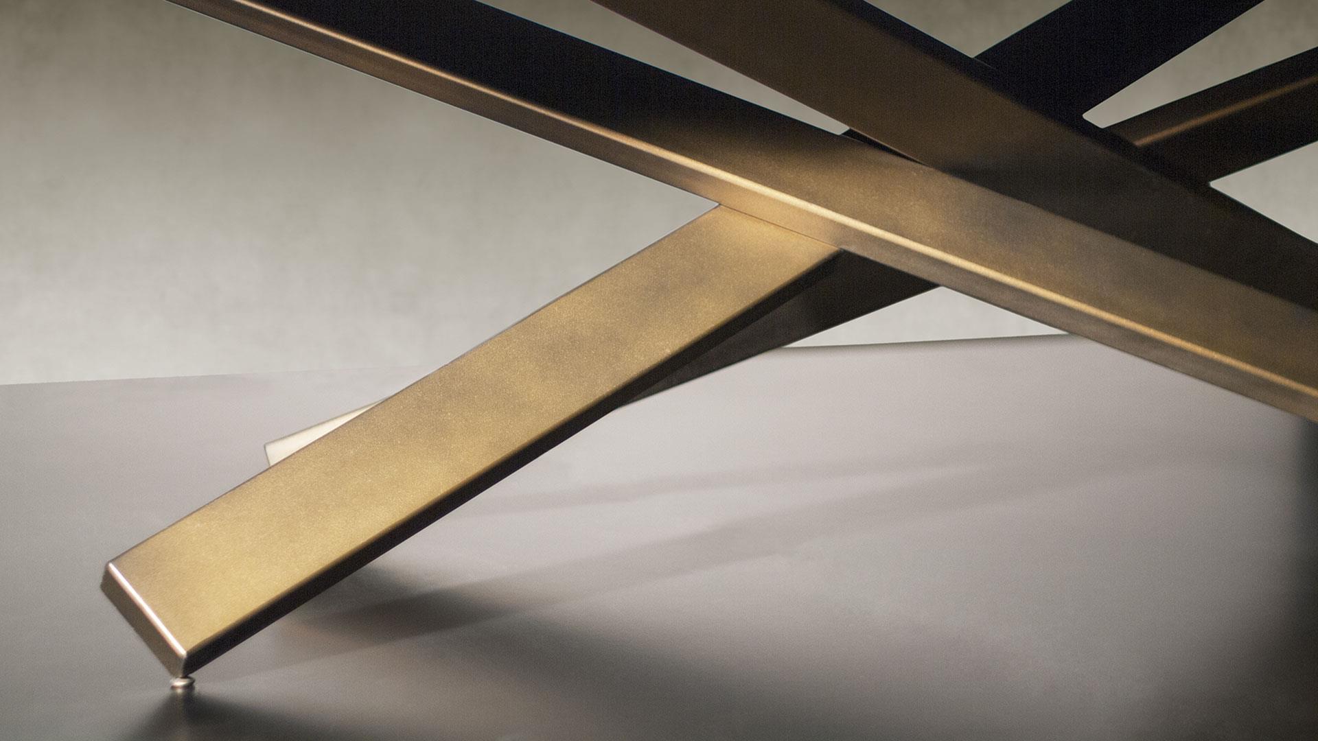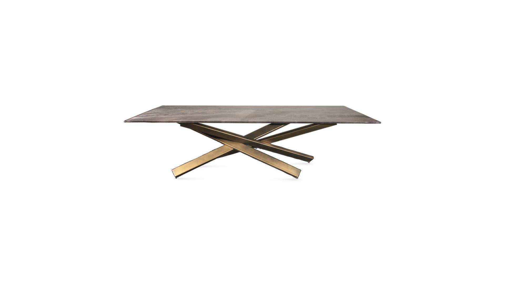 ining table with iron base available in Grafite or in satin brass or titanium finishing.Top available in glass, extraclear glass, smoked glass or in Marble glass
